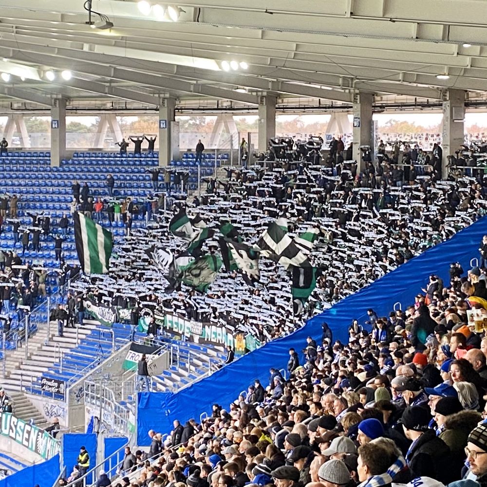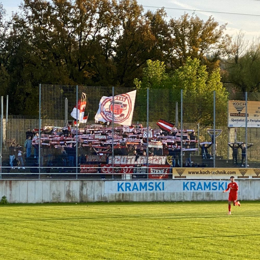Aber es sollte am Ende auch wirklich mehr als erwartet im Wildparkstadion los sein. Die Fanszene aus Westfalen hatte immerhin einen Sonderzug rollen lassen und war insgesamt mit knapp 1.500 Schlachtenbummlern in Baden aufgeschlagen. Das waren ungefähr 500 mehr, als ich im Café Intro prognostiziert hatte. Ich hatte Münster auch viele Jahre nicht mehr gesehen und war nebenbei gespannt wie sich die häufig von Streitereien und Gruppenauflösungen gezeichnete Szene seit der Gründung der neuen Hauptgruppe Fede Nerblo (2021) entwickelt hat. Um das Fazit vorwegzunehmen: Teilweise machten sie ganz gut Alarm, aber es ist weiterhin eher keine Szene, die man in Deutschland unbedingt mal erlebt haben muss.