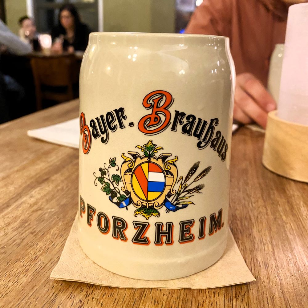 Ein wenig altes Pforzheim lässt sich aber wenigstens auf dem Schlossberg erahnen. Dort steht einerseits die nach schweren Kriegsschäden bereits in den 1950er Jahren wiederaufgebaute Schloss- und Stiftskirche St. Michael (13. Jahrhundert) und andererseits der mittelalterliche Archivturm. Neben letzterem hat das Brauhaus Pforzheim 2003 außerdem die so genannte Einnehmerei*** rekonstruieren lassen (ursprünglich ein barockes Amtshaus von 1669). Das Gebäude ist mittlerweile an das Franchise Lehner’s Wirtshaus verpachtet, deren Gäste wir nun wurden. Wir ließen uns die Pforzheimer Brauerzeugnisse Goldstadt Export und Ratskeller Pils zapfen (0,4 l im Steinkrug für 4,50 €) und dachten darüber nach hier sogleich zu Abend zu essen. Aber irgendwie hauten uns die an den Nachbartischen servierten Speisen auf den ersten Blick nicht um.