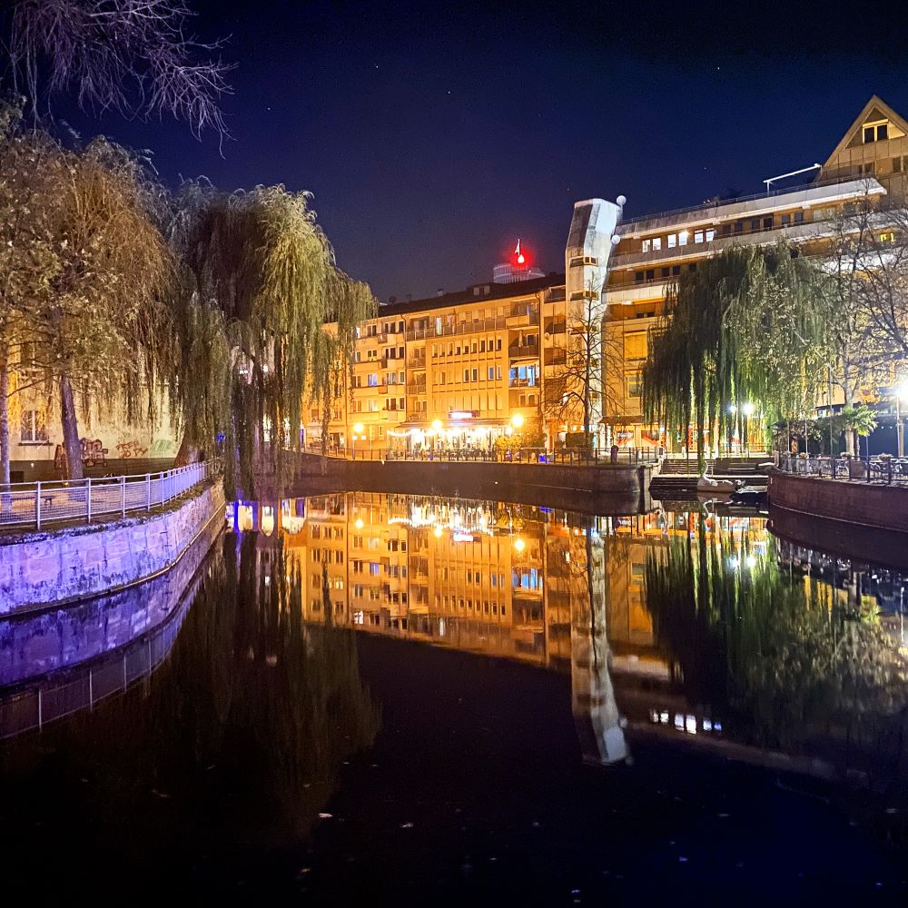Vom Falstaff war es nur noch ein Katzensprung in die Innenstadt. Dort konnte die Dunkelheit keineswegs verbergen, warum Pforzheim gemeinhin als hässliche Stadt gilt. Zwar geht Pforzheim auf eine römische Siedlungsgründung im Jahre 90 n. Chr. zurück, stieg 1220 zur Residenz der badischen Markgrafen auf und entwickelte sich im 18. Jahrhundert zu einem wichtigen Zentrum der Schmuck- und Uhrenindustrie (daher der Beiname Goldstadt). Allerdings wurde das historische Stadtbild erst im Dreißigjährigen Krieg (1618 – 1648) und im Pfälzischen Erbfolgekrieg (1688 – 1697) sehr stark zerstört und das anschließend mühsam wiederaufgebaute Pforzheim radierten die Bomben des Zweiten Weltkriegs (1939 – 1945) wiederum flächendeckend aus.
