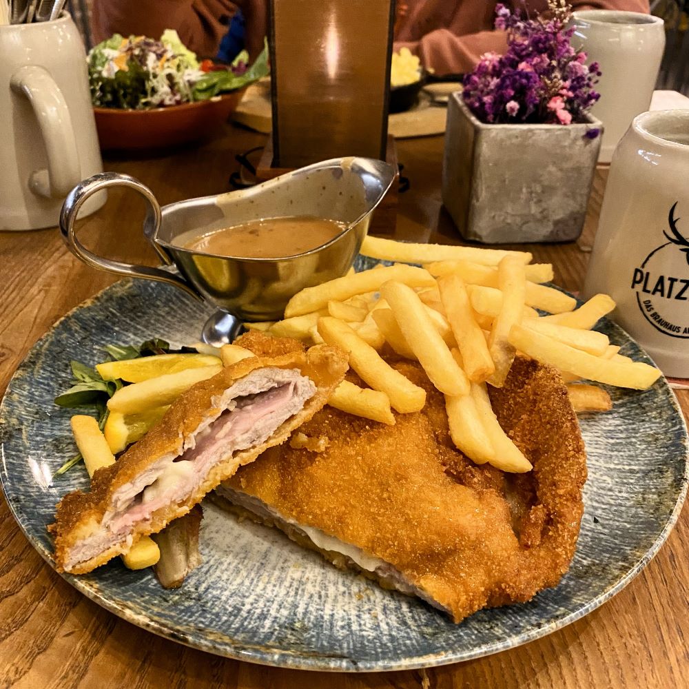 Zum Essen ging es deshalb in den Platzhirsch, wo wir ohne Reservierung tatsächlich noch ein paar Minuten auf einen Platz warten mussten. Dann kam in dieser Brauereigaststätte zunächst zweimal das Hausbier (0,5 l für 4,90 €) auf den Tisch, ehe sich Matteo für die Käsespätzle mit Bergkäse, Röstzwiebeln und kleinem Beilagensalat (11,90 €) entschied, während ich Cordon Bleu vom Kalb mit Pommes frites und Rahmsauce (18,90 €) wählte. Convenience Food scheint auch der Küche dieser Gastwirtschaft nicht unbedingt fremd, aber in Sachen Preis-Leistungs-Verhältnis waren wir beide halbwegs zufrieden mit den gereichten Gerichten.