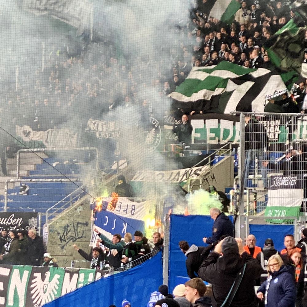 Der Fußballgott hatte aber anscheinend eine andere Meinung als ich und schenkte den Gästen unmittelbar nach der Fackelei den kaum noch für möglich gehaltenen Ausgleichstreffer. Lukas Frenkert konnte in der 2. Minute der Nachspielzeit doch tatsächlich einen Abpraller zum vom Gästeblock frenetisch gefeierten 1:1 abstauben. Mit anderen Worten; ein lahmer Fußballnachmittag hatte ein ziemlich hitziges Ende bekommen.