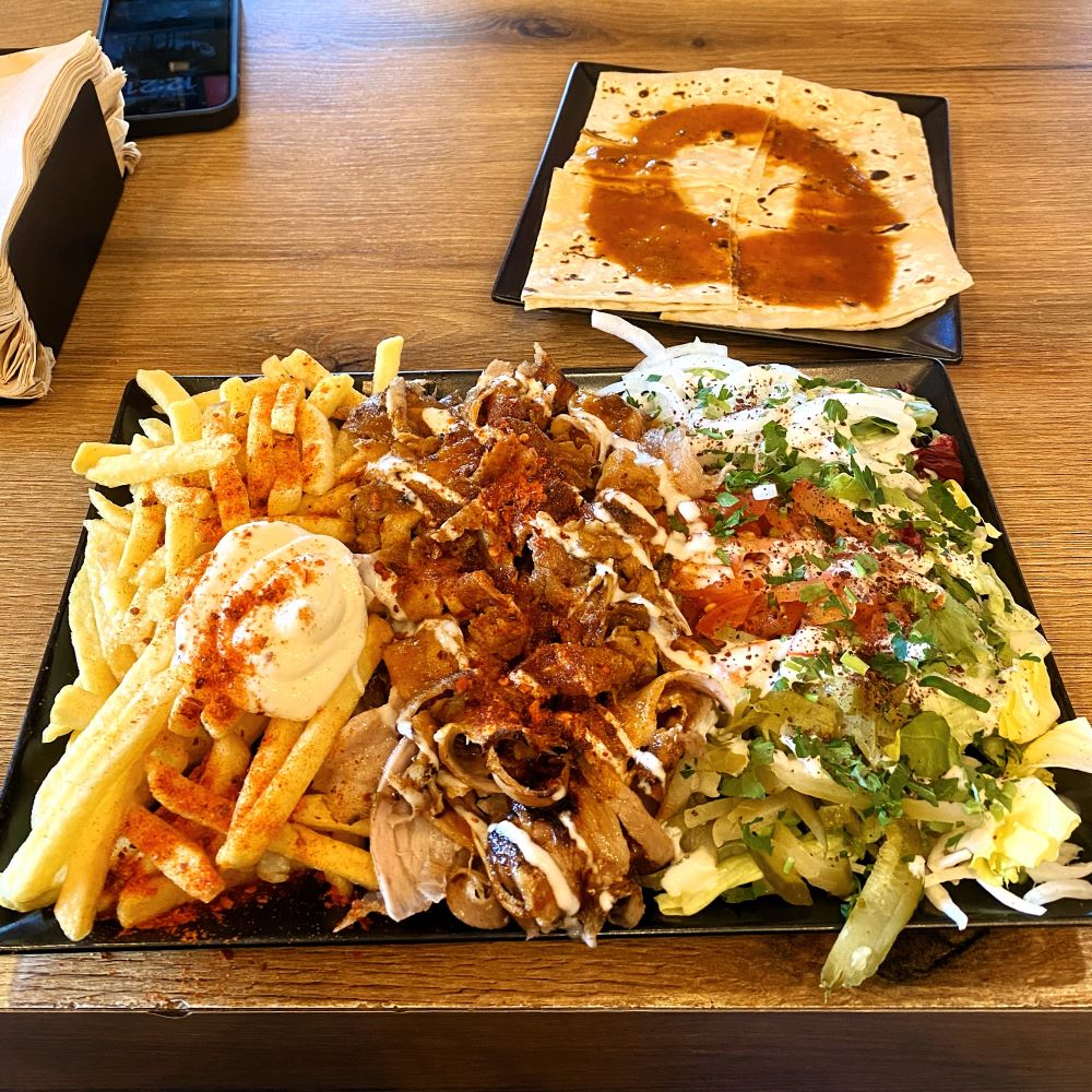 Mannheim erreichten wir um 11:59 Uhr und es blieb somit noch genug Zeit für ein kleines Mittagessen. Heute hatte ich eigentlich Bock auf Gyros bei Pita Pita, aber die hatten Ruhetag. Also lief es doch wieder auf Döner bei Katik hinaus. Während meine Mitstreiter bereits gefrühstückt hatten und daher mit Rollos (9 €) zufrieden waren, bestellte ich mir gierig einen Teller (14,50 €). Wie immer sehr köstlich, ich hätte nur vielleicht nicht ganz so offensiv nachwürzen sollen.
