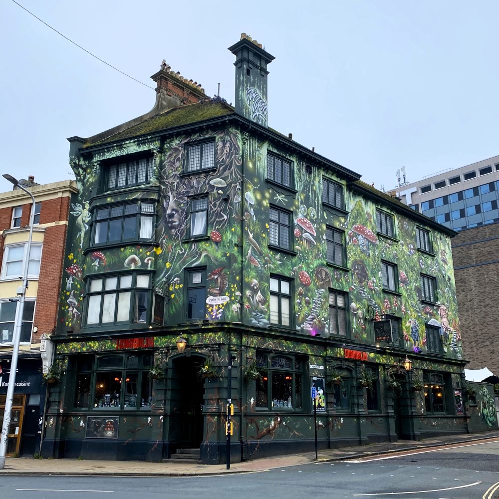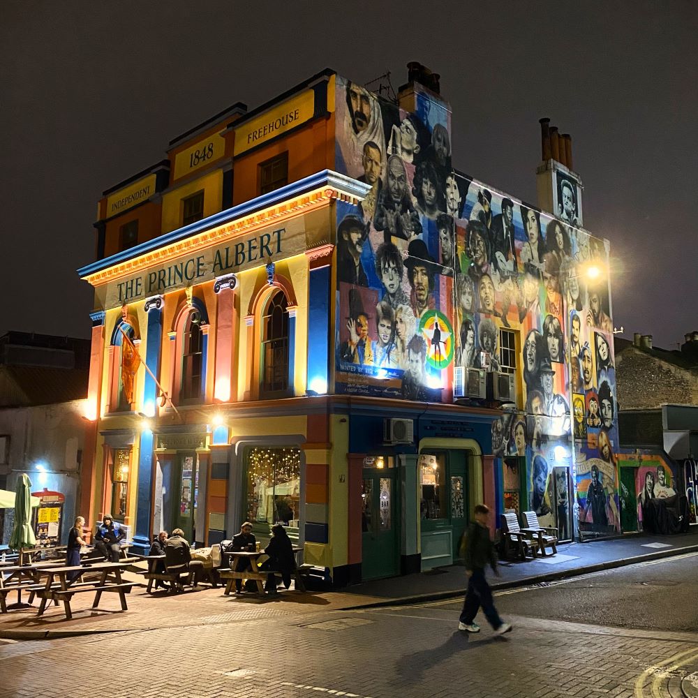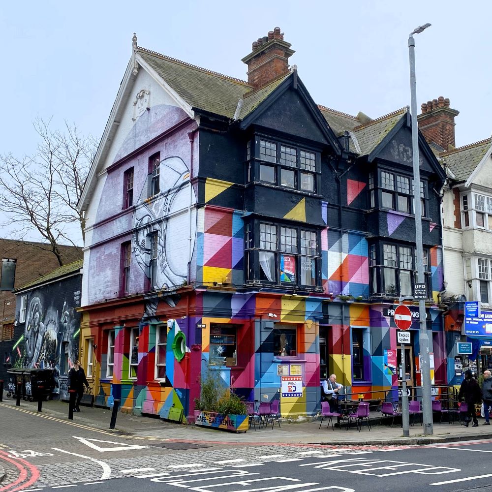 Einiges aus dieser goldenen Epoche des mondänen Bädertourismus ist noch heute zu bewundern. Doch bevor ich den Sehenswürdigkeiten direkt am Meer widmen konnte, musste ich mich erstmal von Preston per pedes nach Süden vorarbeiten. Es ging von der St Peter’s Church durch den ca. 250.000 m² großen Preston Park. An dessen Südende beginnt das Quartier rund die London Road. Dieses Viertel ist bunt und quirlig. Es gibt dort etliche gastronomische Optionen, einen beliebten Trödelmarkt (Brighton Open Market) und obendrein viel Streetart zu entdecken. Besonders tat es mir die Fassade des Pubs Hobgoblin an. Innen übrigens auch ein hübsches Lokal, wie ich bei einem erfrischenden Cider der Mosterei Aspall feststellen durfte.