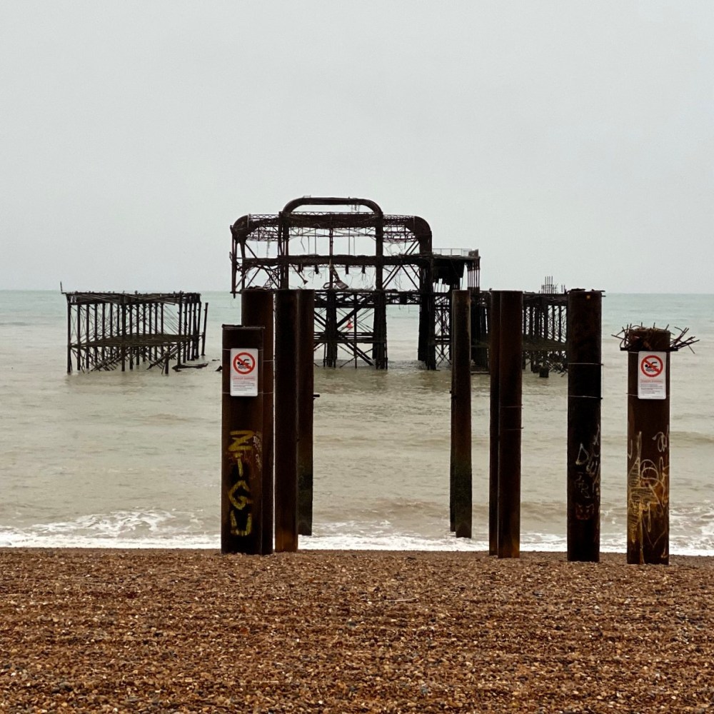 Während der Palace Pier dadurch allerdings selbst im Winter sehr lebendig wirkt, ist sein 1866 eröffneter Nachbar West Pier mittlerweile noch weniger als eine Ruine. Nach einem verheerenden Brand im Jahre 2003 steht von dieser Seebrücke lediglich ein Stahlskelett im salzigen Meerwasser. Wiederaufbaupläne ließen sich nicht realisieren. Stattdessen steckte die Stadt jüngst viel Geld in einen 162 m hohen Aussichtsturm namens i360. Doch diese 2016 eröffnete Attraktion wurde nie wirtschaftlich. Just am 20. Dezember 2024 setzte die insolvente Betreibergesellschaft nun ihre 109 Mitarbeiter auf die Straße, während sie der Stadt Brighton and Hove angeblich noch £ 51 Mio (ca. 60 Mio €) schulden.