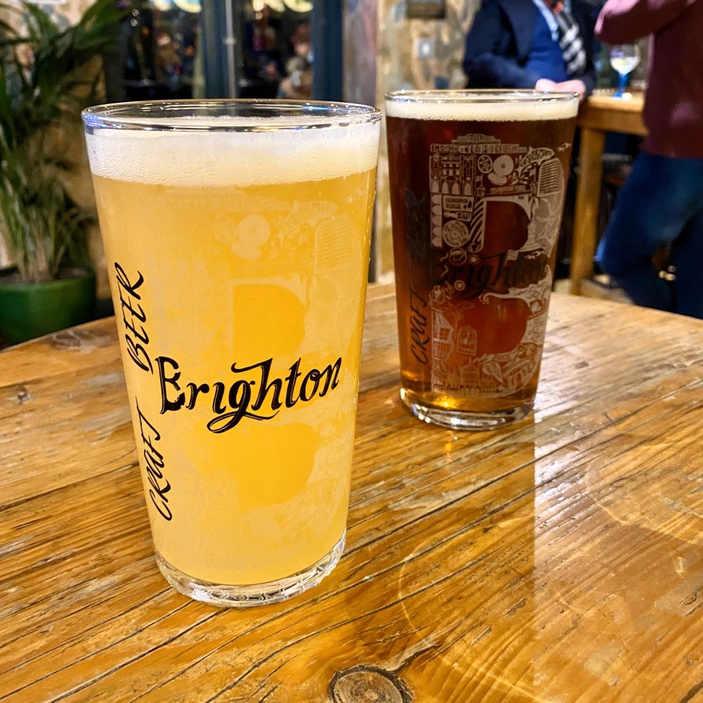 Danach folgte allerdings ein weiterer Tapetenwechsel. Das heutige Match nahte zwar bedrohlich, doch auf dem Weg zum Bahnhof könnte man ja noch zwei, drei weitere Pubs beehren… Erste Station: William the Fourth im North Laine Quarter. Im nach dem Bruder und Thronfolger von King George IV benannten Pub gönnte sich Daniel sich ein Bitter namens Evolve von der Mad Squirrel Brewery, während ich mich für ein fruchtiges und zweifach gehopftes Sussex Haze der 360° Brewing Company entschied.