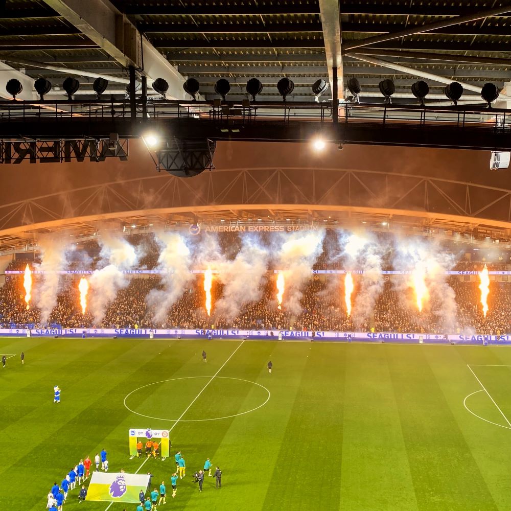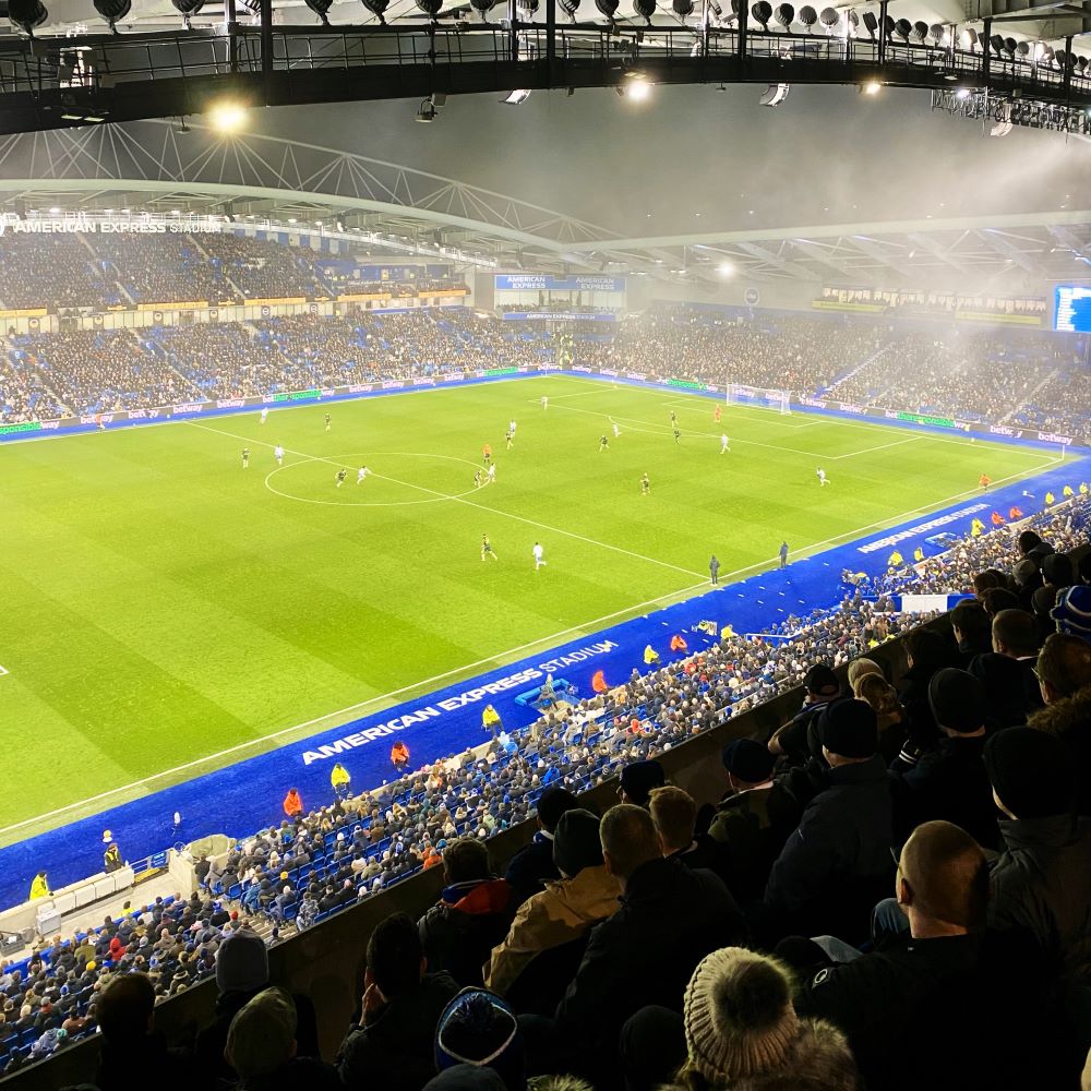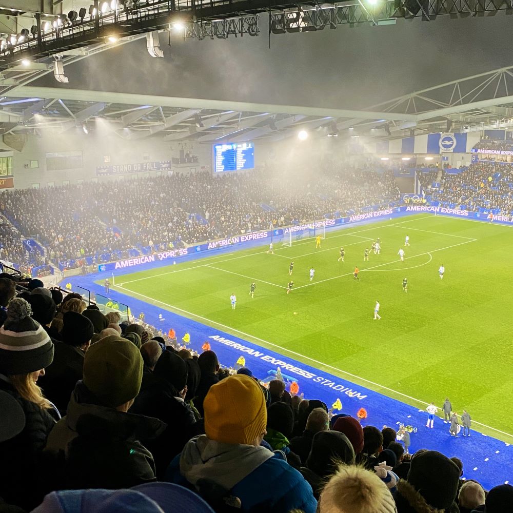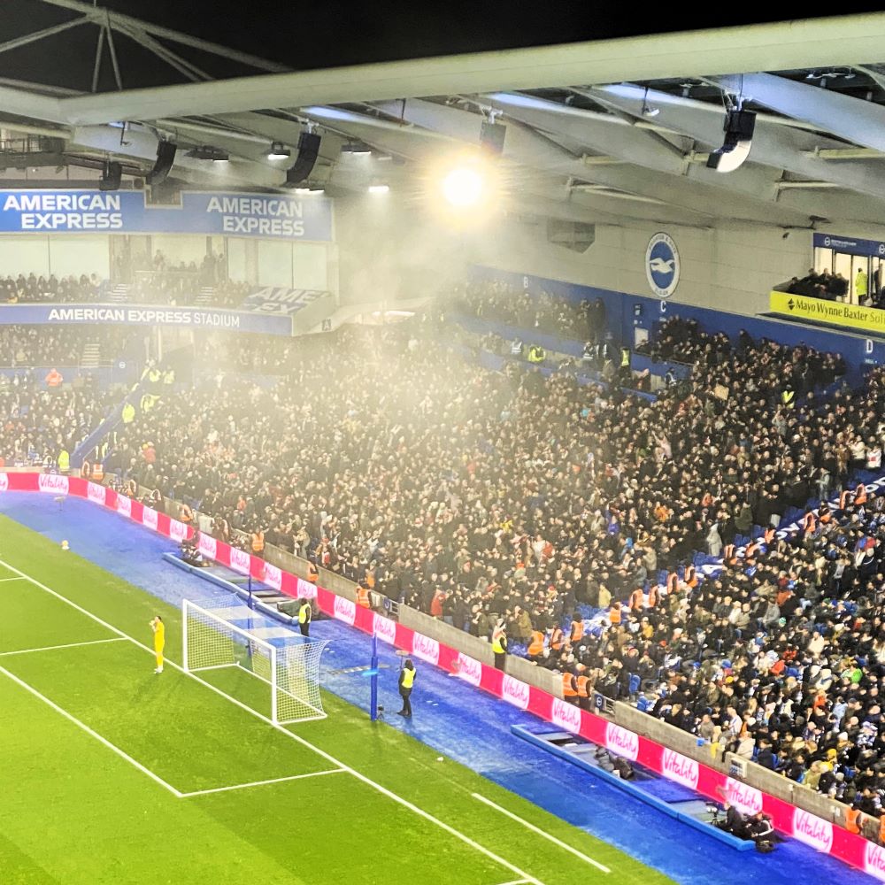 Trotz insbesondere vieler guter Torchancen in der 1. Halbzeit, erwartete die Zuschauer leider ein 0:0, welches in Sachen Stadionstimmung ebenfalls eine Nullnummer war. Lautester Moment des Abends (abgesehen von der Hymne „Sussex by the Sea“ vor Spielbeginn): Als Yoane Wissa in der 14. Minute das vermeintliche 0:1 für die Gäste erzielte, der VAR das Tor jedoch zum Ärger der ca. 3.000 Gästefans wieder kassierte. War auch aus neutraler Sicht schade, denn – £ 5 (ca. 6 €) ins Phrasenschwein – ein Tor hätte dem Spiel sicher gut getan und taktische Marschrichtungen über den Haufen geworfen.