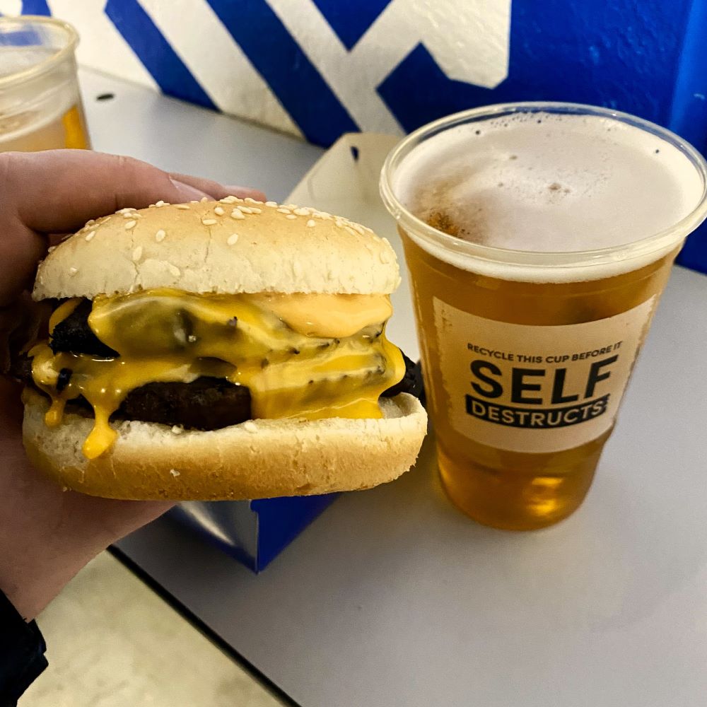 Nach der noch halbwegs sehenswerten 1. Halbzeit, traf ich mich mit Daniel nochmal auf eine Runde Birra Moretti aus dem Zapfautomaten. Außerdem musste meinerseits dringend die zweite Mahlzeit des Tages her. Es wurde ein Double Cheeseburger und ich wünschte mir natürlich, dass der Brighton & Hove Albion FC für jedes Patty und der Brentford FC für jede Schmelzkäsescheibe je einmal im zweiten Durchgang trifft. Doch die Partie wurde schlechter und fortan waren gefährliche Strafraumszenen auf beiden Seiten Mangelware.