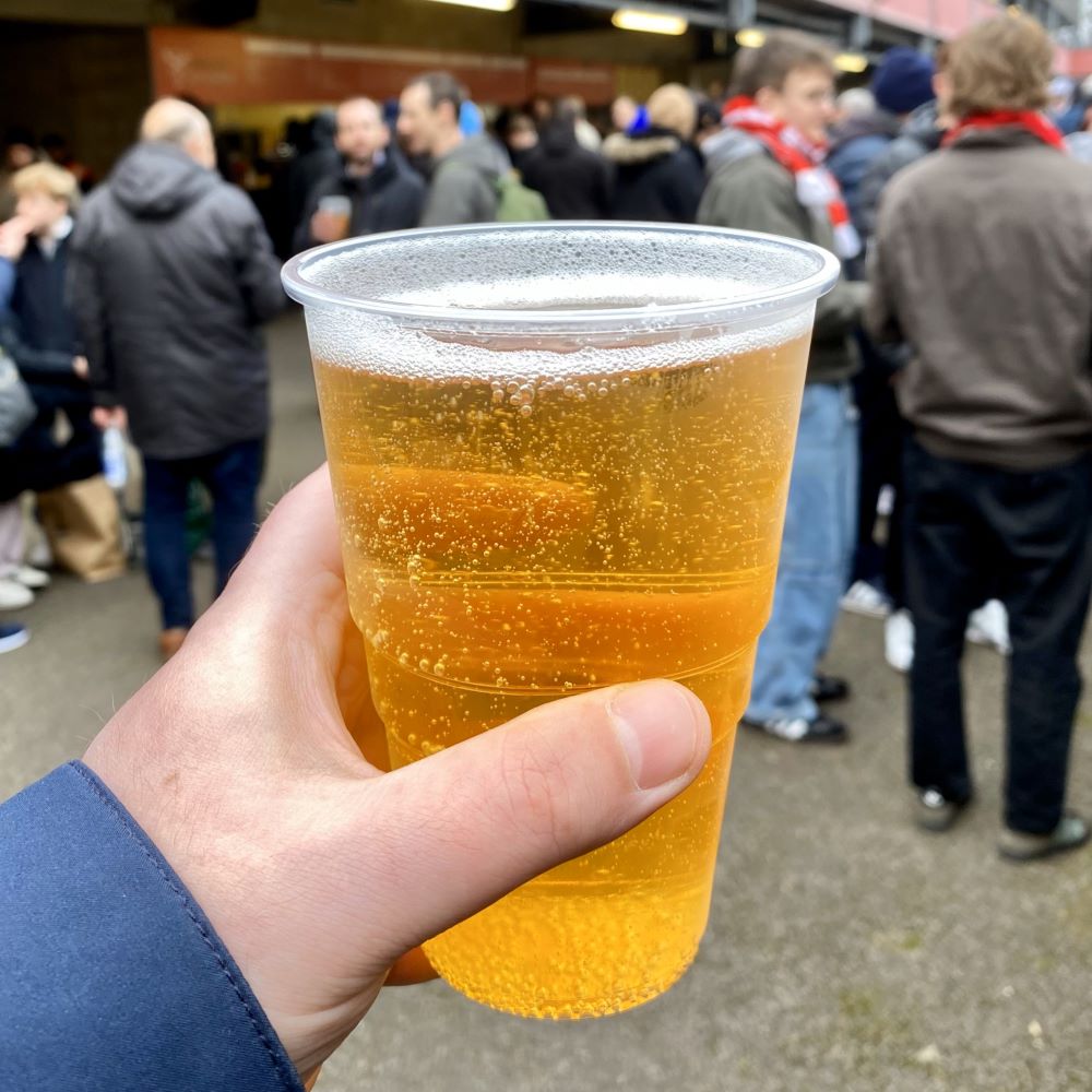 Aufgrund der vielen Treppenstufen und der Traumatisierung aus Charlton, machten wir uns schon in der 39. Minute zum Bierstand auf und verpassten dadurch prompt die nächsten zwei Tore der Liverpudlians. Gakpo (40.) und Salah (44.) hatten das Spiel kurz vor dem Pausenpfiff im Prinzip vorentschieden. Da außerdem Bierautomaten aufgestellt waren, hielten wir unser £ 7.20 (ca. 8,70 €) teures Pint Moretti bereits bei Salahs 0:3 in den Händen. Aber egal, waren bestimmt nicht die letzten Tore des Tages und Johnny konnte gleich mit mir darauf anstoßen, dass der zweite Wettschein so gut wie sicher war.
