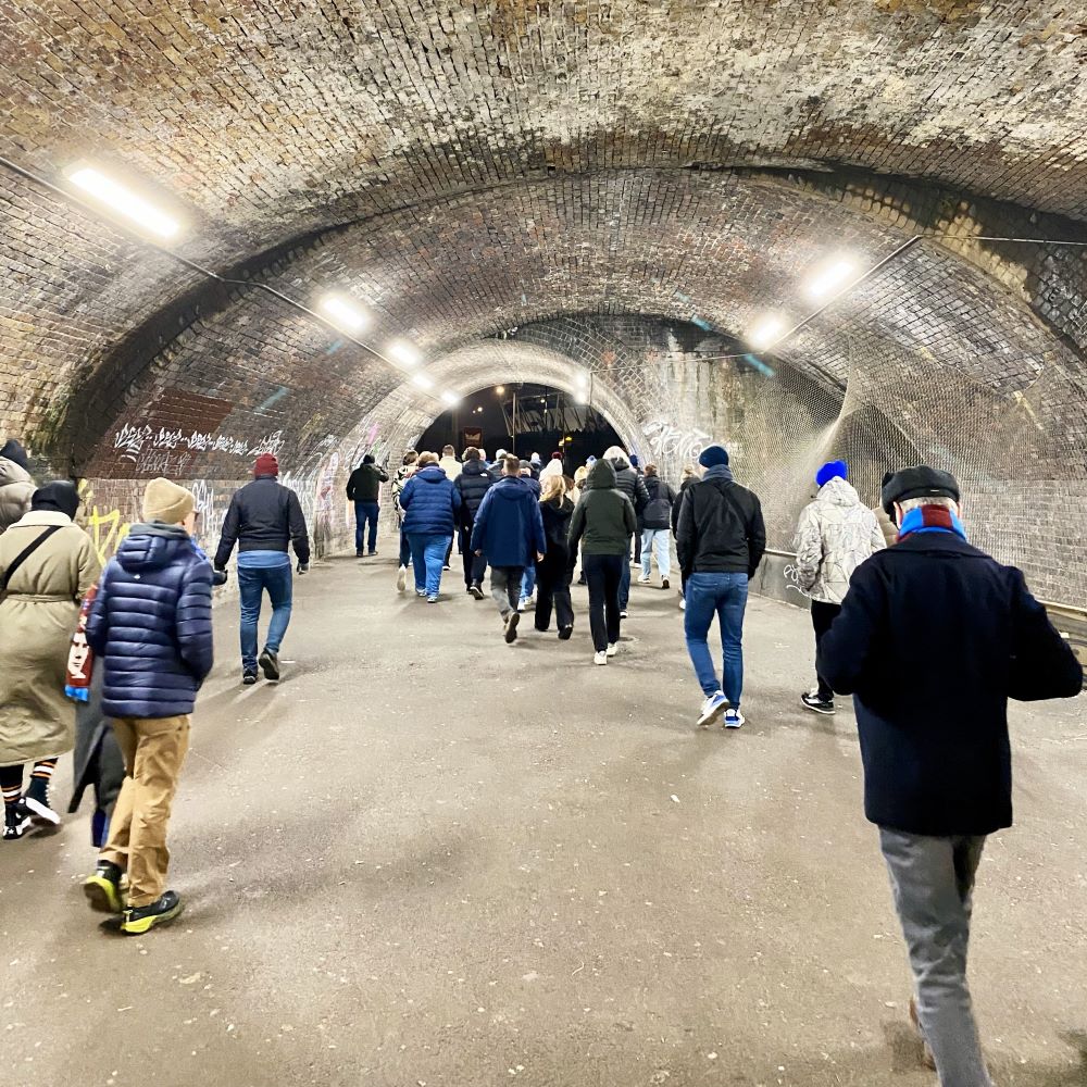 Anschließend folgte noch eine zweite Rutsche Bier, ehe es um 16:20 Uhr zur Bahnstation direkt unter dem Pub ging. Von dort (Haltestelle Cutty Sark) fuhren wir vier Minuten später mit der Docklands Light Railway (DLR) unter der Themse gen Norden. Wir erreichten um 16:47 Uhr die 600 m vom London Stadium entfernte Station Pudding Mill Lane, mussten allerdings zu unserem Block 242 leider noch das halbe Stadion umrunden. Letztlich schritten wir exakt zum ersten Takt von „I’m Forever Blowing Bubbles“ durch’s Mundloch in unseren Block.