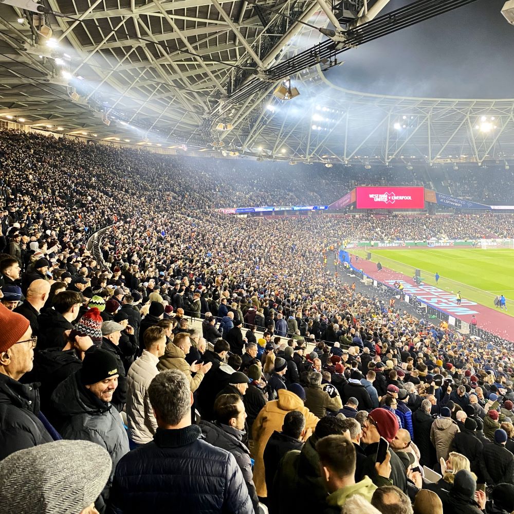 Ausverkauft war das für die Olympischen Spiele 2012 errichtete Stadion heute natürlich dennoch. Der einstige Arbeiterverein aus West Ham (1895 als Thames Ironworks FC gegründet), der 2016 seine angestammte Heimat Upton Park zugunsten des London Stadium aufgab, weiß eben darum, dass man die Hütte bei vielen Spielen auch ohne Ermäßigungen oder andere Zugeständnisse an die Basis voll bekommt. Anstatt der 13jährige Tom und der 86jährige Peter aus East London, gehen gegen Liverpool eben Manpreet aus Mumbai und Chao aus Chengdu für den doppelten oder dreifachen Preis ins Stadion. Oder halt Saša und Johnny aus Hildesheim…