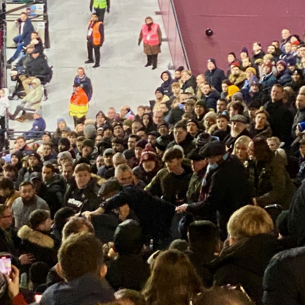 Gut so, denn die Scousers begannen sofort ein Offensivfeuerwerk und hatten in der ersten halben Stunde mehrfach das 0:1 auf dem Fuß. Dass die überfällige Führung tatsächlich erst in der 30. Minute durch Luis Diaz erzielt wurde, war bis dahin vor allem den Paraden von West Hams Schlussmann Areola zu verdanken. Nach dem Treffer passierte nebenbei etwas, womit man in englischen Stadien in diesem Jahrhundert eigentlich nicht mehr rechnet. Ein paar Reihen unter uns freute sich jemand lautstark über das Tor der Reds und bekam prompt von ein paar Sitznachbarn mit Schiebermützen die Fäuste ins Gesicht gedrückt. Das Gerangel weitete sich noch etwas aus und die Stewards trauten sich nicht wirklich einzugreifen. Aber irgendwann kamen Polizisten in den Block und führten ein paar Fans ab. Ich möchte nicht wissen, was den Missetätern nun für Strafen drohen.