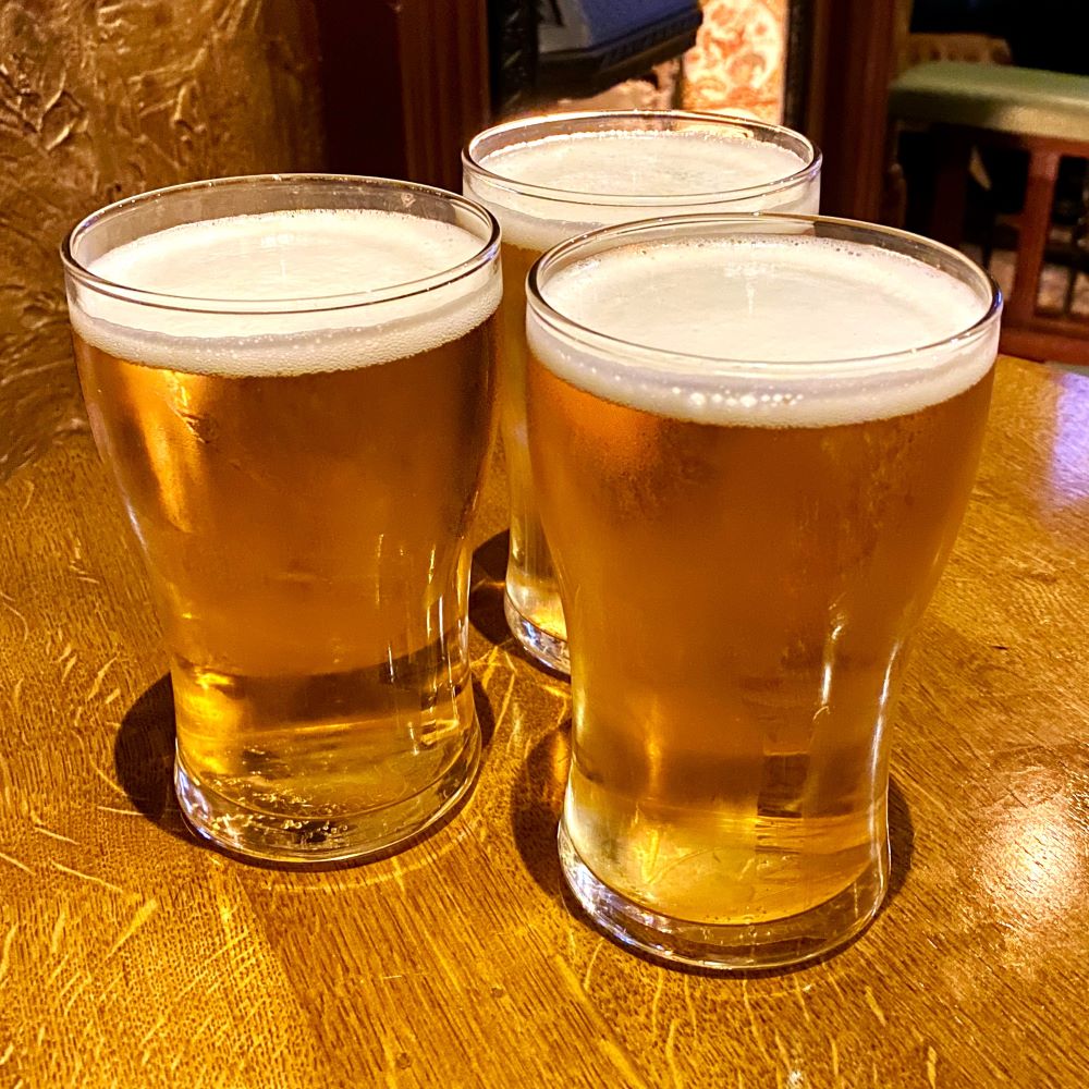 Während sich Jojo nun von Stratford zu Frau und Kind aufmachte, steuerten Johnny und ich per Elizabeth Line von die Tottenham Court Road an. Im West End wollten wir uns mit Daria nach ihrem Musical treffen und mussten bis dahin nochmal ’ne gute Stunde überbrücken. Das taten wir in einem proppenvollen Wetherspoon’s namens The Montagu Pyke, wo wir uns zwei Notting Helles der Portobello Brewery à £ 5.85 (ca. 7 €) zapfen ließen. Darauf folgten nochmal zwei Worthington’s Creamflow, die hier pro Pint £ 2.99 (ca. 3,60 €) kosteten.