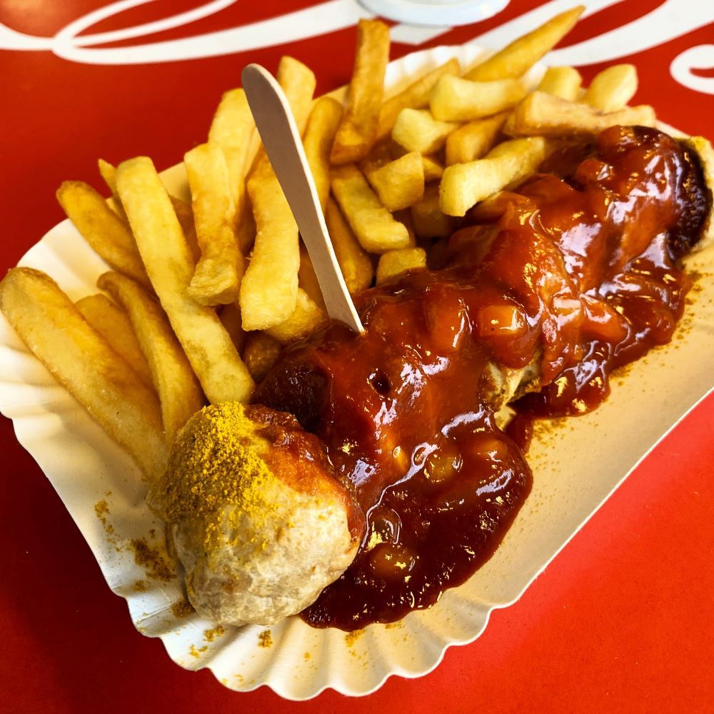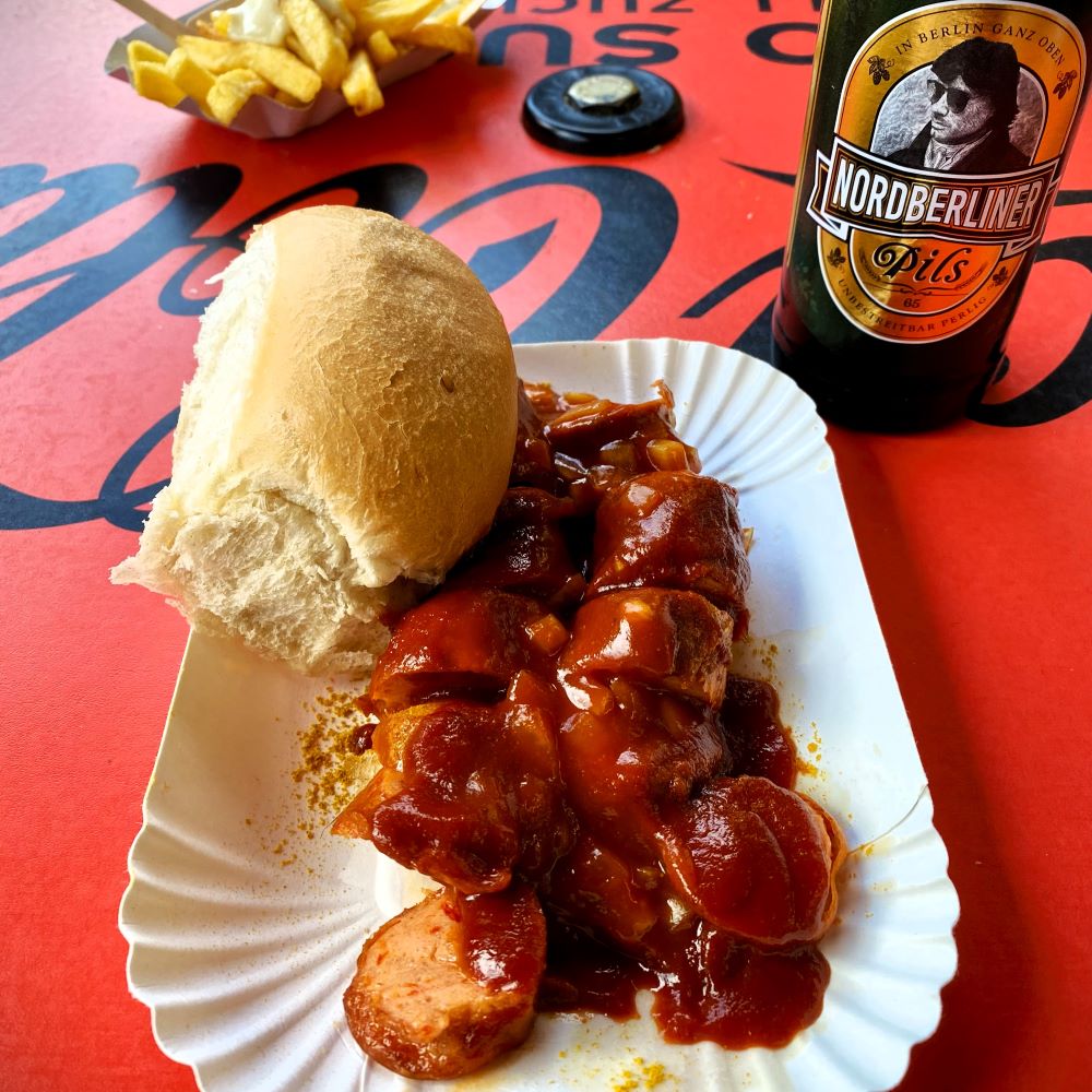 Wir genossen dort zwei Runden Schultheiss und heckten weitere Pläne für den Nachmittag aus. Eine kleine Kneipentour durch die Kieze Gesundbrunnen und Wedding wäre doch was. Doch bevor die Anzahl der heute besuchten Kneipen schon mal verdoppelt werden konnte, musste auch bei Max und Kaja noch was Warmes in den Magen. Es zog sie ebenfalls zur zumindest lokal berühmten und beliebten Curry Baude und nur zugucken wollte ich auch nicht. Jetzt wurde es aber zur Abwechslung ein pikanter Chilibeisser mit Brötchen (2,90 €), während meine Freunde Pommes und die vegane Currywurstvariante des Hauses kosteten.