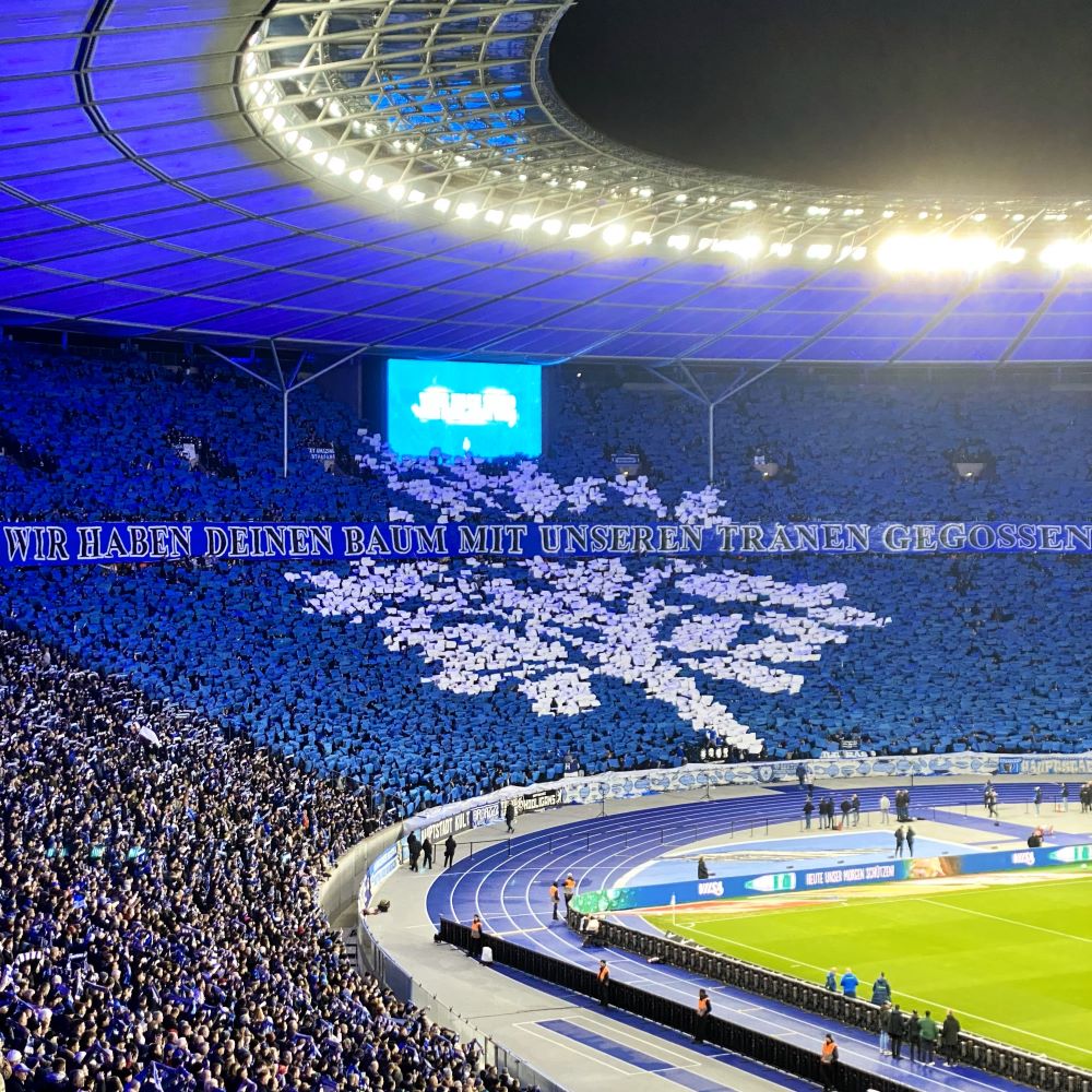 Vor einem Jahr hatte man bereits die Botschaft „Wir gießen deinen Baum mit unseren Tränen – in unseren Herzen wirst du ewig leben“ postuliert. Heute hieß es „Wir haben deinen Baum mit unseren Tränen gegossen“. Passend dazu wurde mittels Papptafeln ein ausgewachsener Baum mit Blätterkleid in die Ostkurve gezaubert. Anschließend folgte eine Blockfahne, welche mutmaßlich Kays Tochter unter dem Apfelbaum sitzend zeigte. Papas ikonische Hertha-Trainingsjacke hing über ihrem Stuhlrücken und im Hintergrund strahlte die Sonne über dem Olympiastadion. Untertitelt mit „Doch wir bleiben auf deinem Weg und ernten die Früchte unserer Überzeugungen“.
