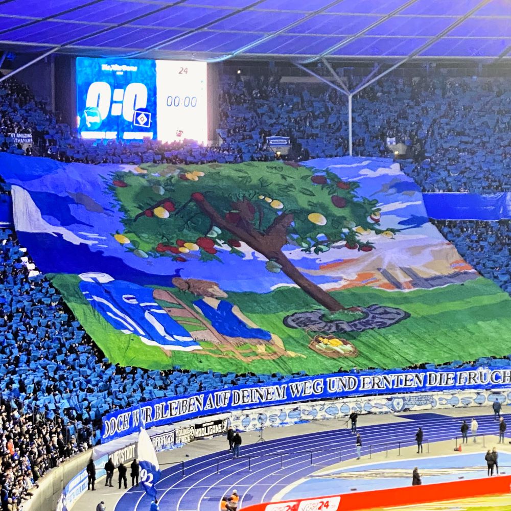 Durch bevor Hauptstädter und Hansestädter sich ihr Gesangsduell auf den Rängen lieferten, wurde vor großer Kulisse an einen großen Herthaner gedacht. Kay Bernsteins viel zu früher Tod hatte sich vor wenigen Tagen zum ersten Mal gejährt. Das bewegte die Ostkurve zu einer zweiteiligen Choreographie, bei der zunächst der von Kay nach seiner Wahl zum Hertha-Präsidenten gepflanzte Apfelbaum im Mittelpunkt stand.