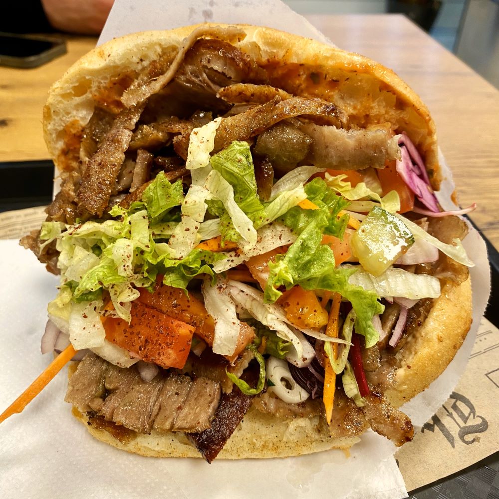Um 18 Uhr verabschiedete sich leider Lumi von uns, da er anstatt für Hertha ’ne Karte für den heutigen Auftritt von Pöbel MC in Neukölln hatte und zuvor noch zum Abendessen verabredet war. Zugleich knurrten auch in der Restrunde ein, zwei Mägen und Abhilfe durfte die Dependance von Hakiki Döner am U-Bahnhof Osloer Straße schaffen. Meinerseits per Big Döner (8 €).