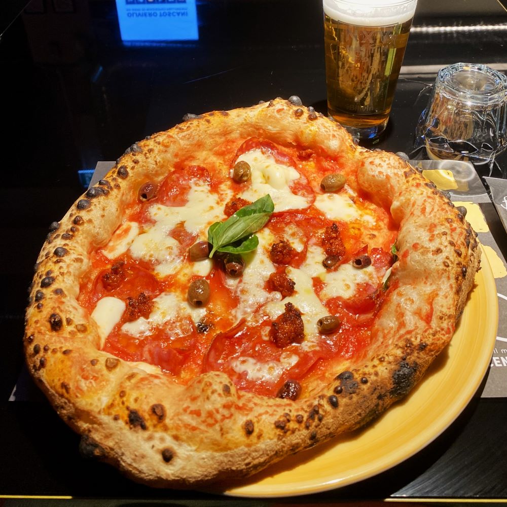 Ich versuchte mich noch für den eigentlich angedachten Restaurantbesuch zu motivieren. Aber zu dieser späten Stunde nahm ich aus Bequemlich- und Müdigkeit doch lieber mit dem Mercato Centrale am Hauptbahnhof der lombardischen Hauptstadt Vorlieb. Jener Viktualienmarkt versorgte mich nun mit einem großen Bier vom Fass (Baffo d’oro) und einer noch größeren Pizza Piccante (mit u. a. Spianata calabrese und Nduja calabrese) aus dem Steinofen. War köstlich, kostete zusammen 20 € und versöhnte mich wieder mit der Welt.