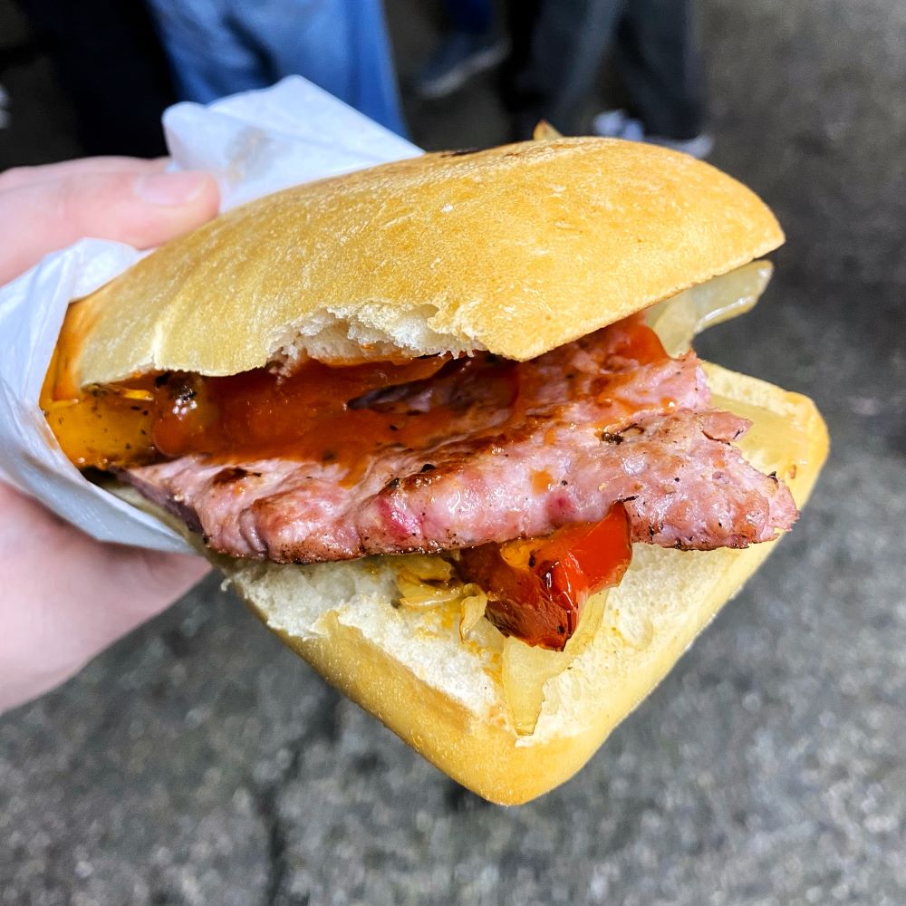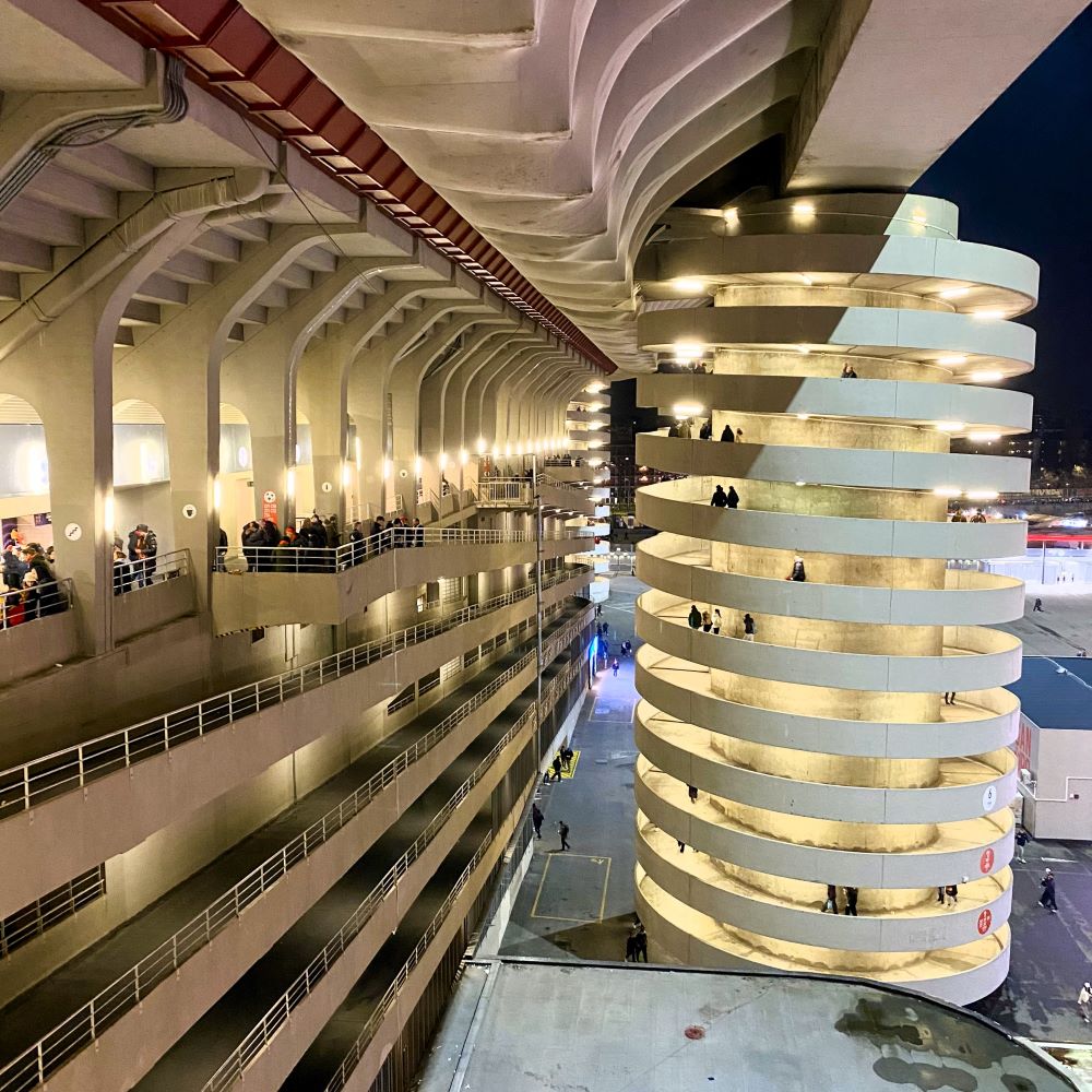 Da wäre theoretisch sogar noch ein Zwischenstopp für eine Pizza o. ä. drin gewesen. Aber ein Panino mit Salamella, Paprika und Zwiebeln (8 €) von einem der Food Trucks vor’m Stadion tat es auch. Zumal sich mit einem nur bedingt vollen Magen die ganzen Stockwerke in den 3. Rang der Haupttribüne viel besser meistern ließen. Denn wie schon vor wenigen Monaten gegen Brügge in der UEFA Champions League (siehe Milano 10/2024), saß ich erneut auf einem der billigsten Plätze. Damals kostete ein Sitz in besagtem Stadionbereich 29 €, heute verlangte die Associazione Calcio sogar nur 12 €.
