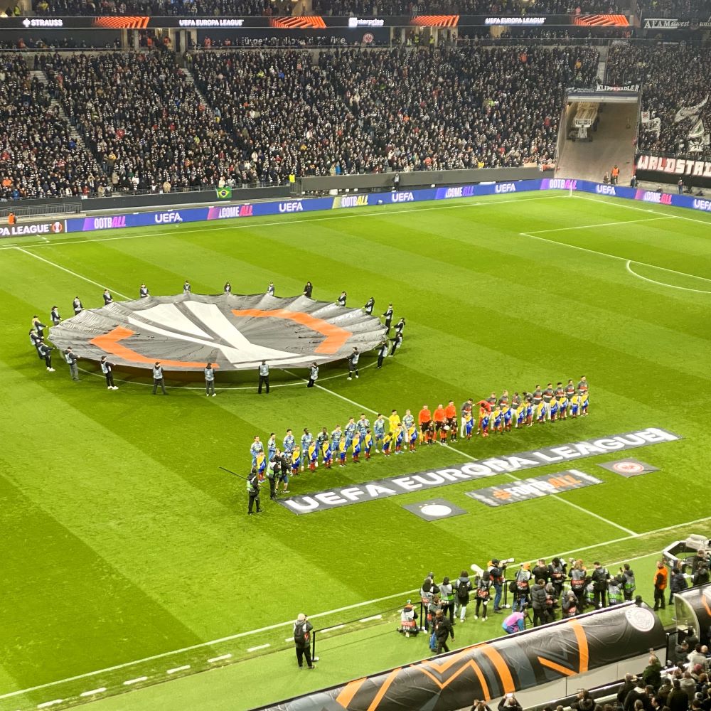 Um der Mannschaftsaufstellung, der großen Schalparade zur Eintracht-Hymne „Im Herzen von Europa“ (siehe Titelbild) und einer etwaige Choreographie aus nächster Nähe beizuwohnen, ging es allerdings zehn Minuten vor Anpfiff auf die Plätze. Die erhoffte Choreographie gab es zwar nicht, aber dennoch war die Stimmung im restlos ausverkauften Rund bereits sehr elektrisierend. Da hatten die ca. 3.000 mitgereisten Niederländer es schwer, sich ebenfalls Gehör zu verschaffen.
