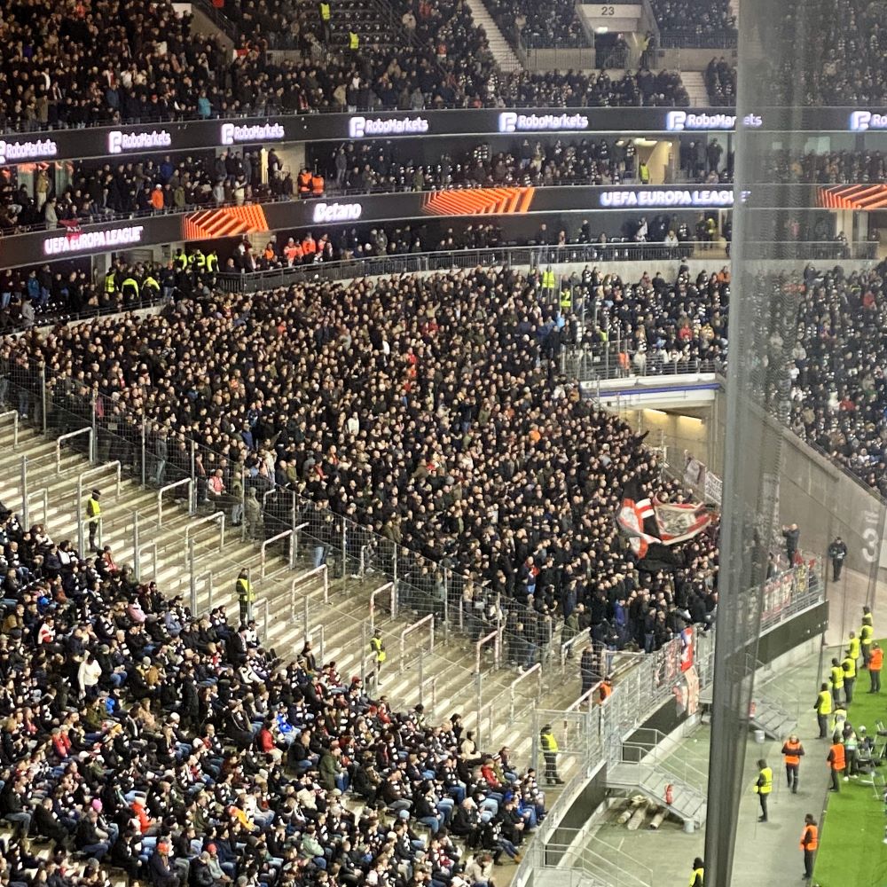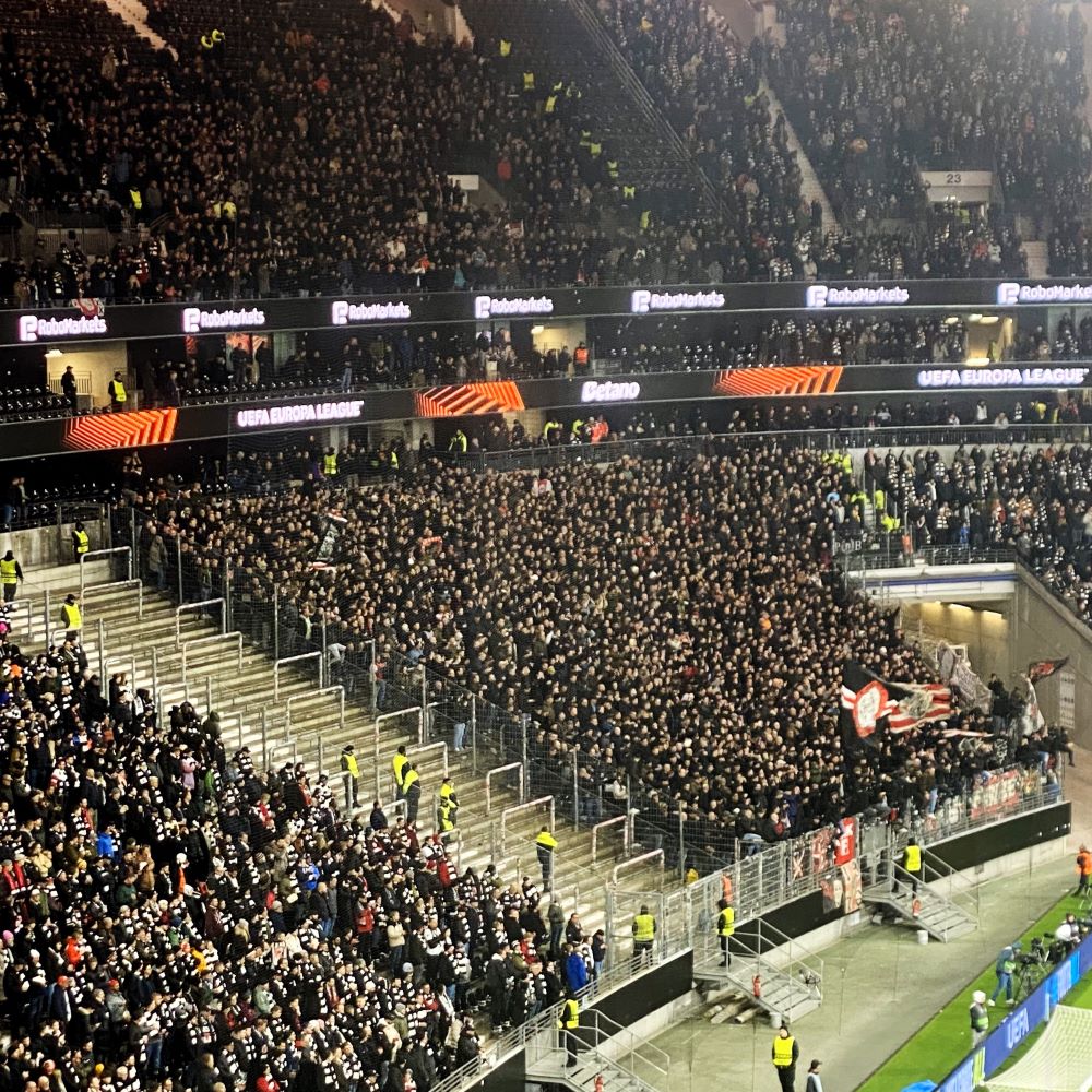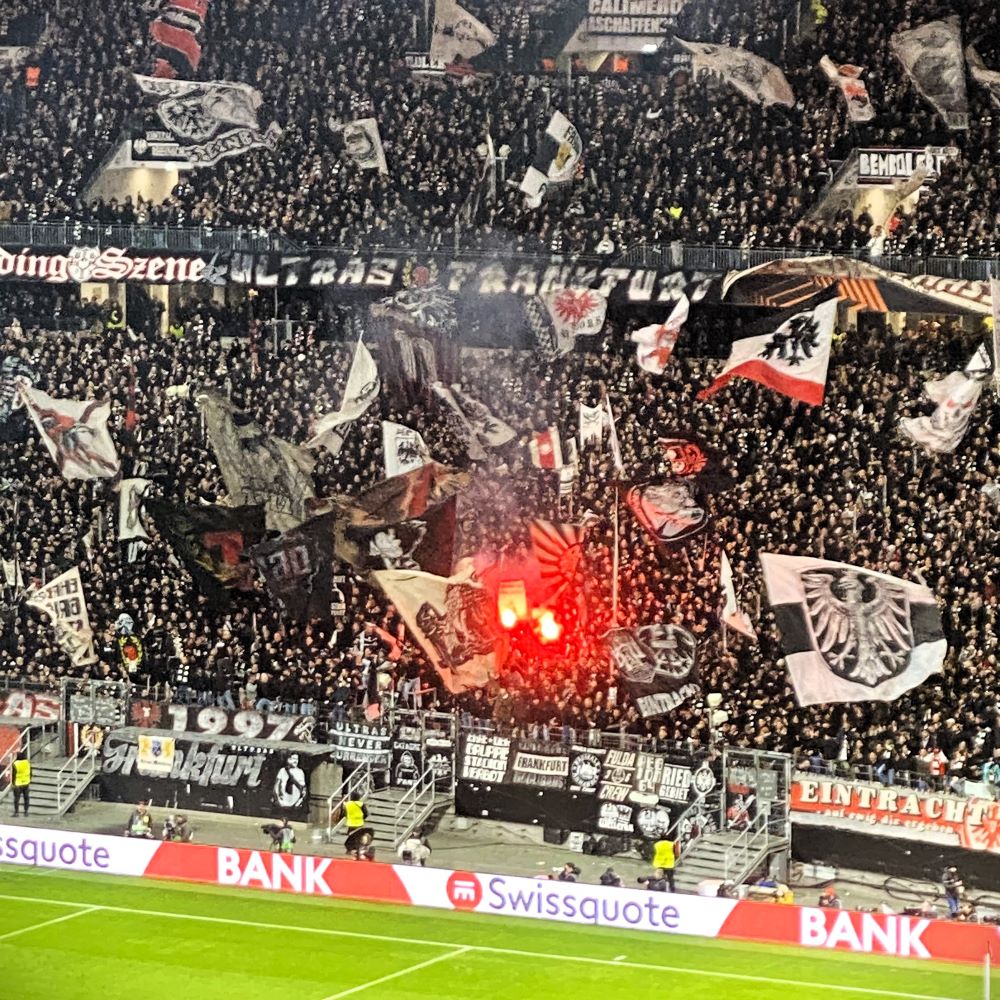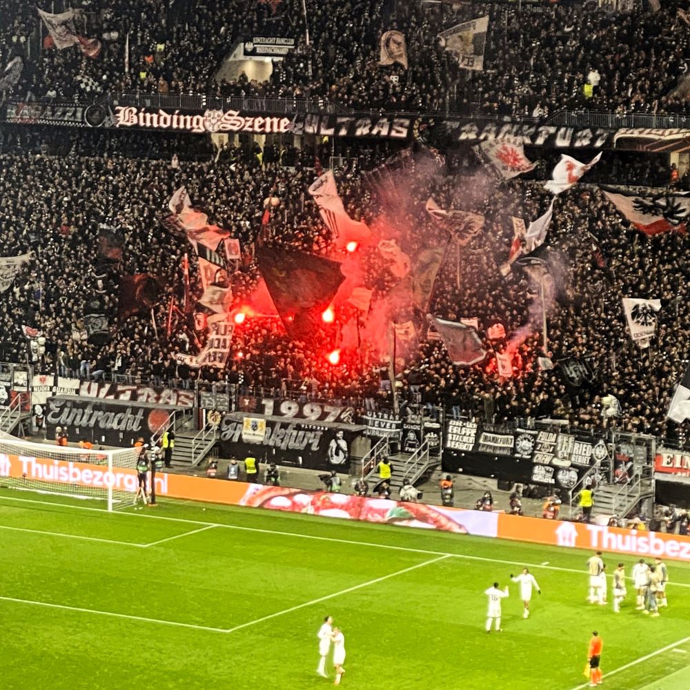 Dass die Eintracht bereits in der 7. Minute durch Jean-Matteo Bahoya in Führung gehen konnte und der heute überragend spielende Mario Götze in der 25. Minute auf 2:0 erhöhte, war der Atmosphäre natürlich auch alles andere als abträglich. So brannten nach den beiden Treffern erste Freudenfeuer in der Nordwestkurve und die Mitmachquote bei den intonierten Fangesängen blieb konstant hoch. Bis zur Pause blieb die Diva vom Main so dominant, dass nach überzeugenden ersten 45 Minuten kaum noch jemand am Weiterkommen gezweifelt haben dürfte.