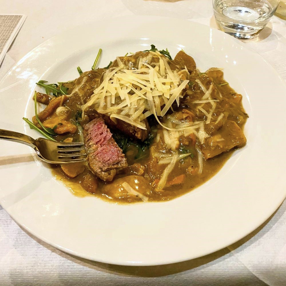 Danach kam als Secondo das Filetto di Manzo con Funghi porcini, Rucola e Grana Padano an den Tisch. Ich hatte mir jenes vom Kellner empfohlene Rinderfilet medium braten lassen, was gut klappte. War zwar erwartungsgemäß nicht das beste Stück Rindfleisch, dass ich je gegessen habe. Aber schmecken tat’s durchaus und der Rucola, der Käse und insbesondere die Steinpilze setzten schöne weitere Akzente auf der Zunge.