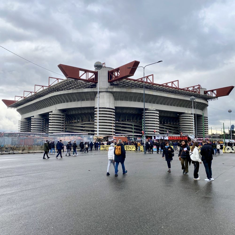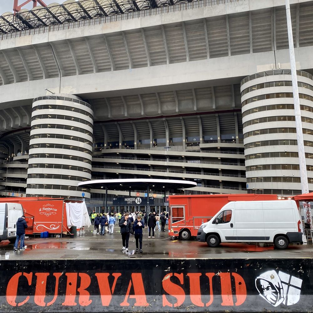Anschließend machte ich einen kleinen Abstecher zum keine 1.000 m entfernten Duomo di Milano. Aber nicht aus touristischen Motiven, sondern weil ich am berühmten Dom der Stadt in die nächstbeste Tram nach San Siro einsteigen wollte. Das dortige Stadio Giuseppe Meazza erreichte ich schließlich gegen 16:30 Uhr und ging nach etwas Lungerei vor der Curva Sud durch ein Drehkreuz.