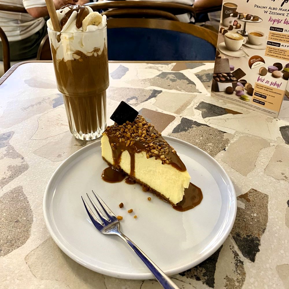 Der Trakt Królewski findet sein nördliches Ende am Zamek Królewski (Königsschloss) und für dieses bedeutende Bauwerk hatte ich mir heute um 14:30 Uhr ein 60 Złoty (ca. 14 €) teures Time Slot zur Besichtigung gebucht. Doch weil ich fast eine Stunde zu früh am Schloss ankam, war noch Zeit für einen süßen Imbiss in einem am Königsweg gelegenen Café des polnischen Chocolatiers E. Wedel. Dort gönnte ich mir ein Stück Käsekuchen mit Karamellsauce und einen Schokobananenshake für zusammen 55 Złoty (ca. 12,90 €).