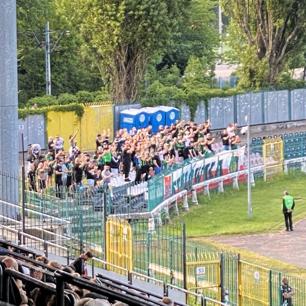 Um 17:11 Uhr erreichte ich dann das 1928 eröffnete und offiziell nach dem General Kazimierz Sosnkowski benannte Stadion Polonii Warszawa, welches ich heute bereits zum dritten Mal besuchte. Allerdings waren es zuvor zwei Viertligaspiele im Jahr 2022 und mittlerweile ist der 2013 durch einen Lizenzentzug ins Amateurlager abgestürzte Klub Sportowy Polonia wieder in der 2. Liga zurück. Der 1911 gegründete Traditionsverein könnte gar noch diesen Sommer die Rückkehr in die Ekstraklasa feiern, da man als gegenwärtig Sechster noch eine Restchance auf den Aufstieg hat. Schließlich spielen die Plätze 3 bis 6 nach dem Ablauf der regulären Saison noch einen dritten Aufsteiger aus, wohingegen die beiden erstplatzierten Teams direkt hoch gehen.