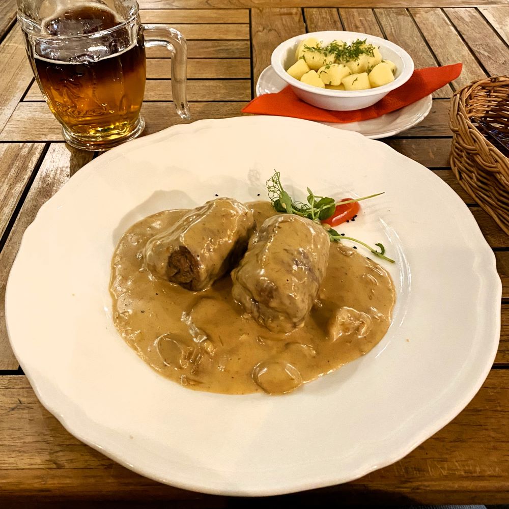 Auf der in die Kategorien Proletariat und Bourgeoisie eingeteilten Speisekarte entschied ich diesmal für die Sztandarowy żur vorweg und für Zrazy wołowe à la Marszałek Tito als Hauptgang. Serviert wurden mir nun zunächst eine polnische Sauersuppe mit Pilzen, Ei und Wurst- und Speckeinlage, zu der außerdem noch ein Brotkorb und Schmalz gereicht wurden. Hinter dem Hauptgericht verbargen sich wiederum mit Pilzen, Speck und Senf gefüllte, sowie mit Wacholder und Bisongras marinierte Rinderrouladen. Diese wurde mit einer cremigen Waldpilzsauce serviert und dazu hatte ich aus der Speisekarte noch Minikartoffelklöße als Beilage gewählt.