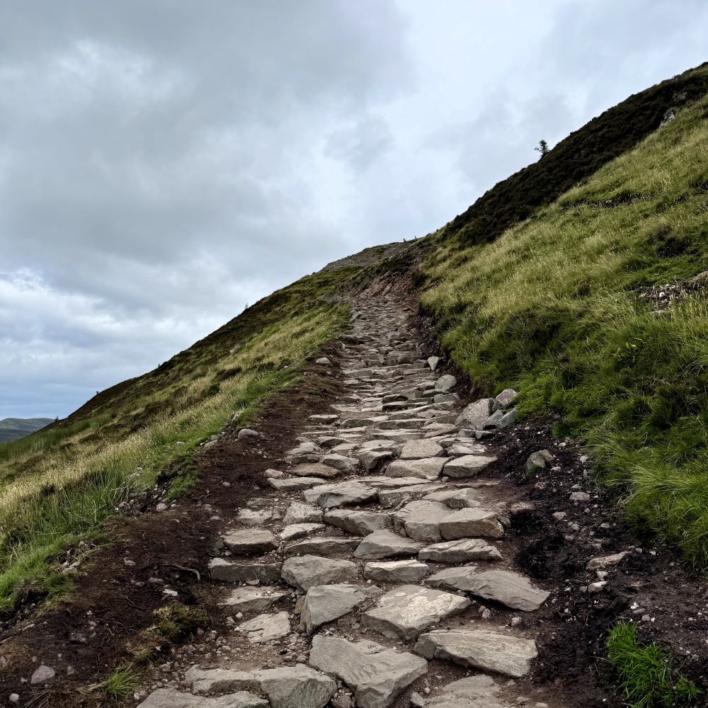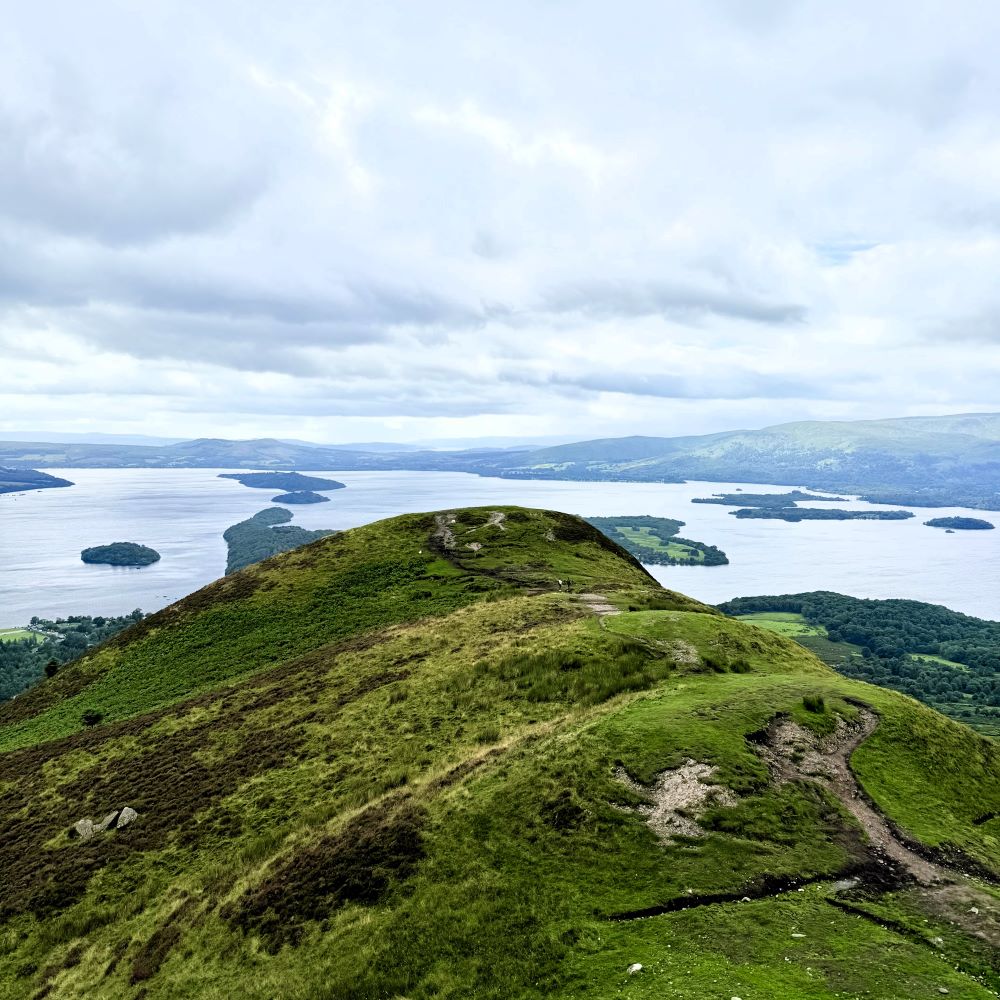 Witzigerweise änderte sich an diesem Punkt auch das Wetter schlagartig. Am Conic Hill peitschten heftige Winde und ich musste Jacke, Mütze und Schlauchtuch aus dem Rucksack holen. Daher lud der nach insgesamt neun Wanderkilometern erreichte Gipfel des Conic Hill (358 m ü. NN) trotz herrlicher Ausblicke nicht zum besonders langen Verweilen ein.