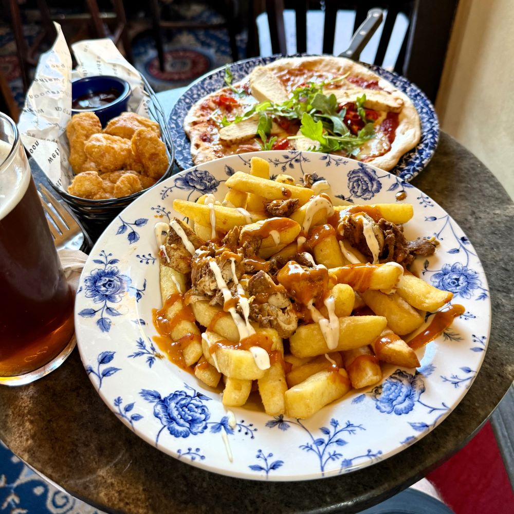 Ich wählte ’ne kleine Pizza mit Hähnchenbrust, Salami und Schinken, sowie eine mit Chicken Shawarma beladene Portion Chips. Da ich weder zwei Pizzen, noch zwei Portionen Fritten bestellen wollte, wurde das Duo schließlich mit Chicken Filet Bites zum Trio gemacht. Ferner musste natürlich auch ein Bier her. Diesbezüglich entschied ich mich für ein preiswertes Pint Belhaven 80 Shilling und kam so auf eine Rechnungssumme von £ 13.79 (ca. 16 €).