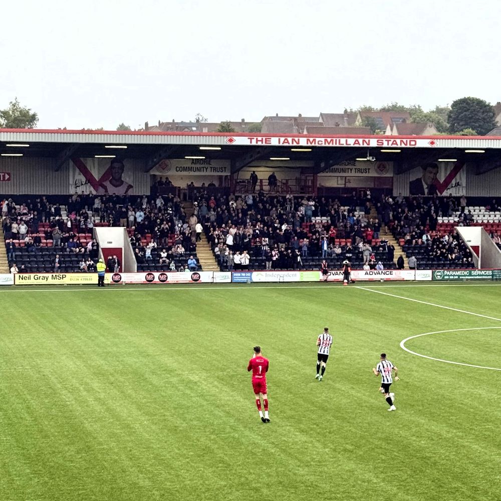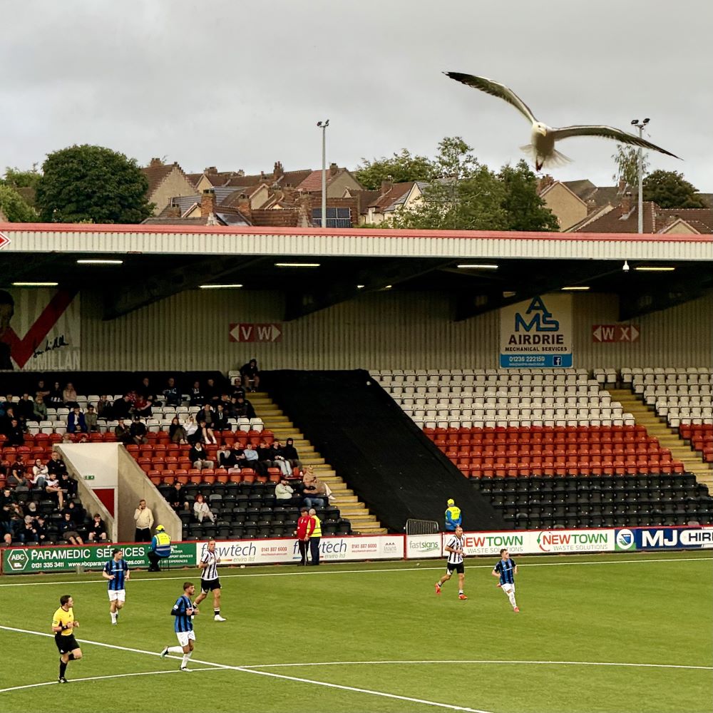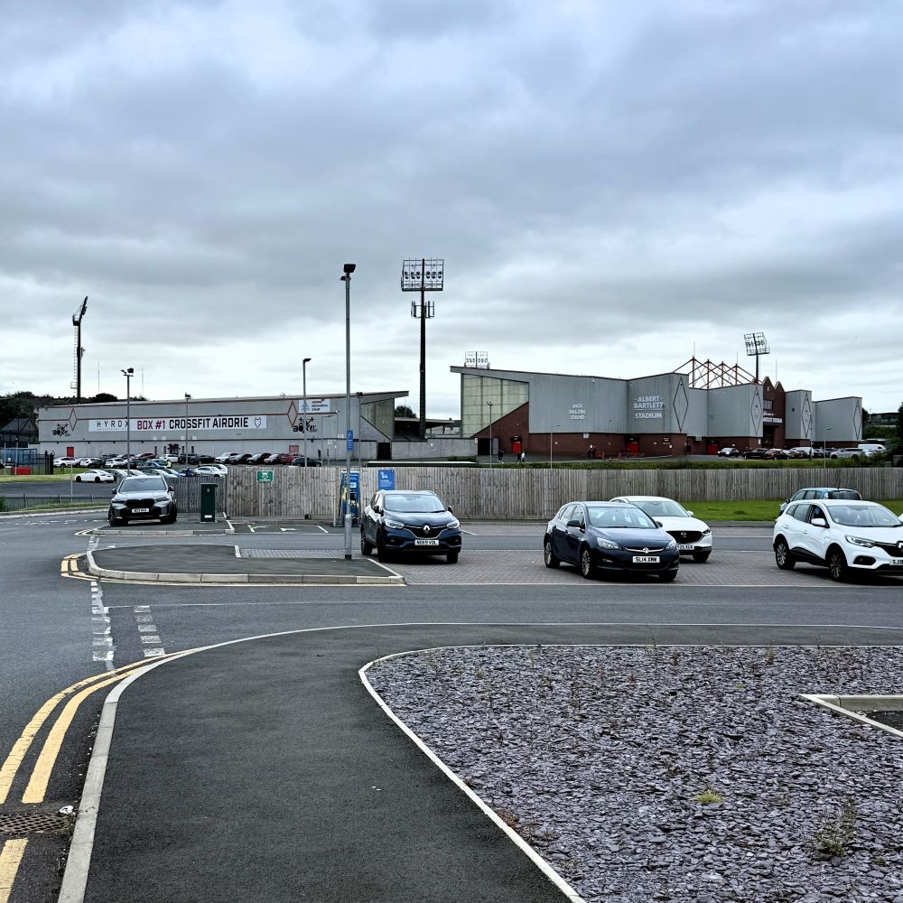 Um 18:36 Uhr erreichte ich den ca. 20 km von Glasgow entfernten Spielort und hatte dort mangels Sehenswürdigkeiten nichts außer Fußball auf der Agenda. Allerdings liegt das von rund 37.000 Menschen bewohnte Airdrie ziemlich hoch und zum rund 2.000 m vom Bahnhof entfernten Stadion musste ich einen der hiesigen Hügel überschreiten. Na ja, nennen wir es eine schöne Ergänzung zur heutigen Wanderung.