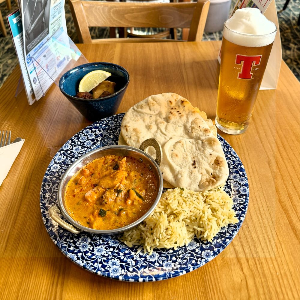 *Es gab im Glasgower Pub The Hengler’s Circus ein Chicken Tikka Masala, welches in diesem Wetherspoon’s heute inklusive einem Pint Tennant’s Lager £ 12.65 (ca. 14,65 €) kostete. Übrigens soll Chicken Tikka Masala in den 1960er Jahren ausgerechnet in Glasgow vom im Pakistan geborenen Koch Ali Ahmed Aslam kreiert worden sein. Aber beim beliebtesten Currygericht Großbritanniens ist es wie mit der Currywurst in Deutschland. Es gibt verschiedene Versionen, wer der Erfinder ist.