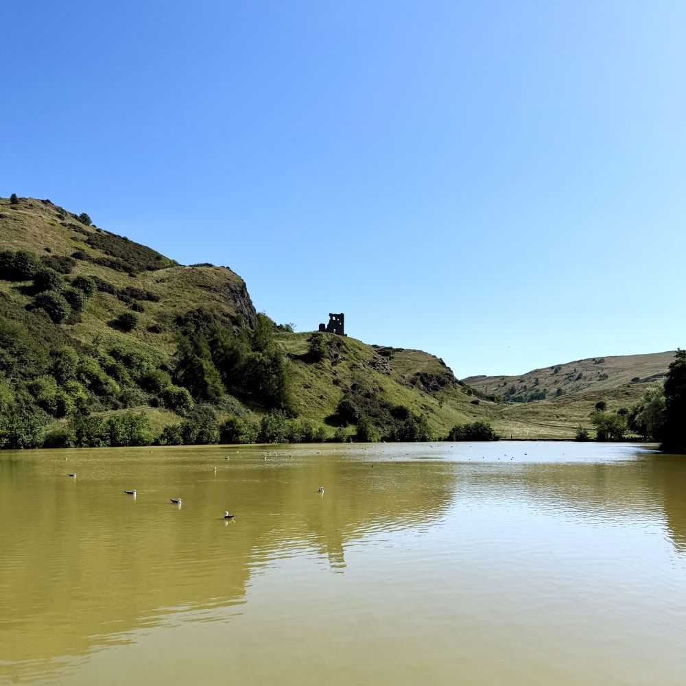 Startpunkt war um exakt 16:30 Uhr das St Margaret’s Loch nahe des Palace of Holyroodhouse. Von jenem aufgrund von Cyanobakterienbefall mittlerweile weniger malerischen See stieg ich auf die Salisbury Crags. Auf dem einsamen Klippenweg der imposanten Felsformation genoss ich die herrlichen Ausblicke über Edinburgh und den Nordseearm Firth of Forth, während sich wenige hundert Meter Luftlinie entfernt eine regelrechte Menschenkette auf dem Arthur ihm seinen Seat hochquälte.
