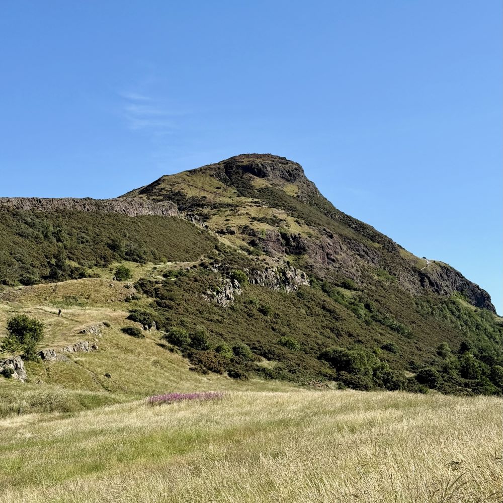Anschließend war mein nächster Programmpunkt ein kurzer Ausflug in die Berge. Trotz sehr sommerlicher Temperaturen (25° C) wollte ich nämlich gerne noch auf Edinburghs Hausberg Arthur’s Seat hinauf. Das wollte ich wiederum nicht auf der Touriroute tun, sondern mich dem 251 m hohen Gipfel im buchstäblich hohen Bogen über die bis zu 171 m hohen Salisbury Crags annähern.