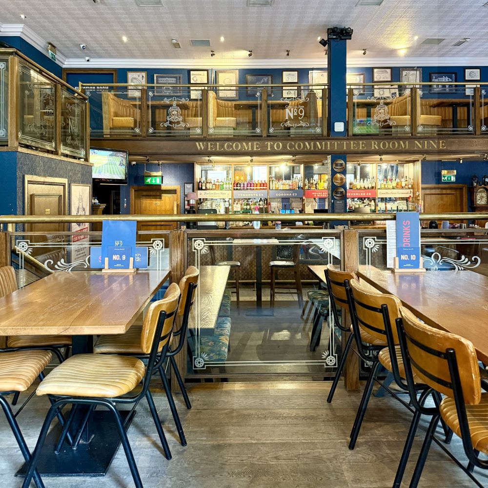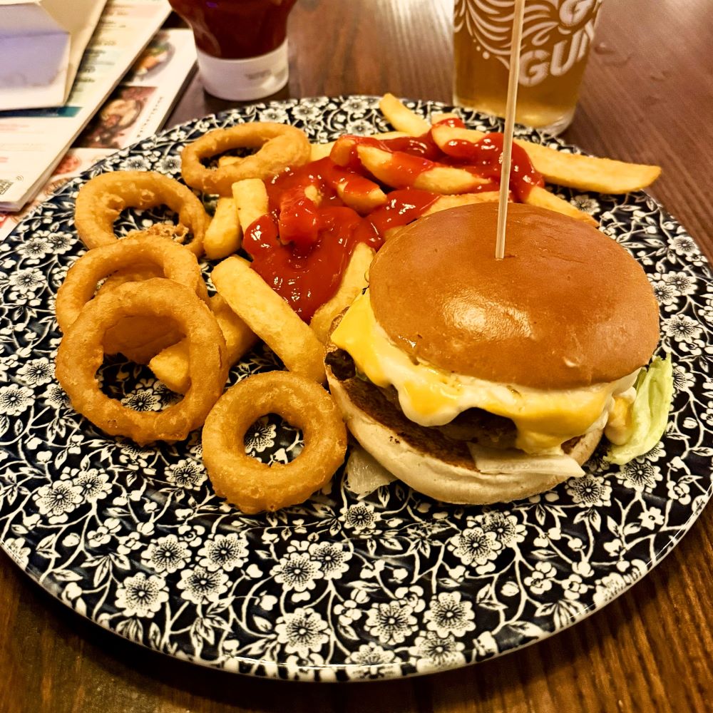 Zum Essen wechselte allerdings noch den Wetherspoon‘s, da mich mir im The Counting House noch mehr „Stimmung & Drumherum“ erhoffte. Ich bestellte dort für zusammen £ 12.49 (ca. 14,50 €) ein Pint Innis & Gunn Lager und den Cheese Meltdown Burger mit Chips und Onion Rings. Natürlich keine kulinarische Offenbarung, aber immerhin ist Wetherspoon’s beim Hackfleischrundstück wieder von den frechen 3oz zu den gewohnten 6oz zurückgekehrt (Vgl. London 12/2024). Außerdem war allein schon die Atmosphäre das Geld wert. Hier wurde am Samstagabend mal wieder vorgeglüht, als gäbe es keinen Sonntagmorgen.