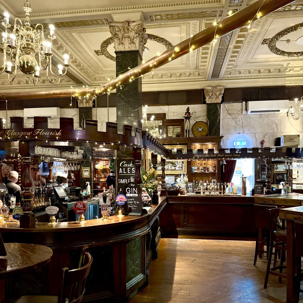 In Hotelnähe lachte mich der Committee Room No. 9 an, wo ich für zusammen £ 16.40 (ca. 19 €) ein Pint Camden Hells Lager und eine Portion Haggis mit Neeps & Tatties bekam. Das Bier und das Ambiente in dem früheren Salon der Glasgower Honoratioren waren super, aber das Essen schien ein Fertiggericht aus Mikrowelle zu sein. Ich habe auf jeden Fall schon deutlich besseres Haggis gegessen.