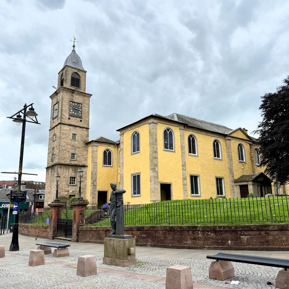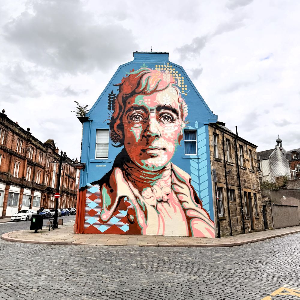Ich bewegte mich zunächst durch den historischen Kern der im 14. Jahrhundert erstmals urkundlich erwähnten Stadt und stolperte dabei zwangsläufig über zwei große Namen. Der erste war der Whiskyfabrikant Johnnie Walker (* 1805; † 1857). Seine gleichnamige Marke ist wahrscheinlich in 96 % der Bars auf diesem Planeten hinter der Theke zu finden. Allerdings gehört sie heutzutage zum Großkonzern Diageo und der hat 2012 das Stammhaus in Kilmarnock gegen alle Widerstände dicht gemacht.