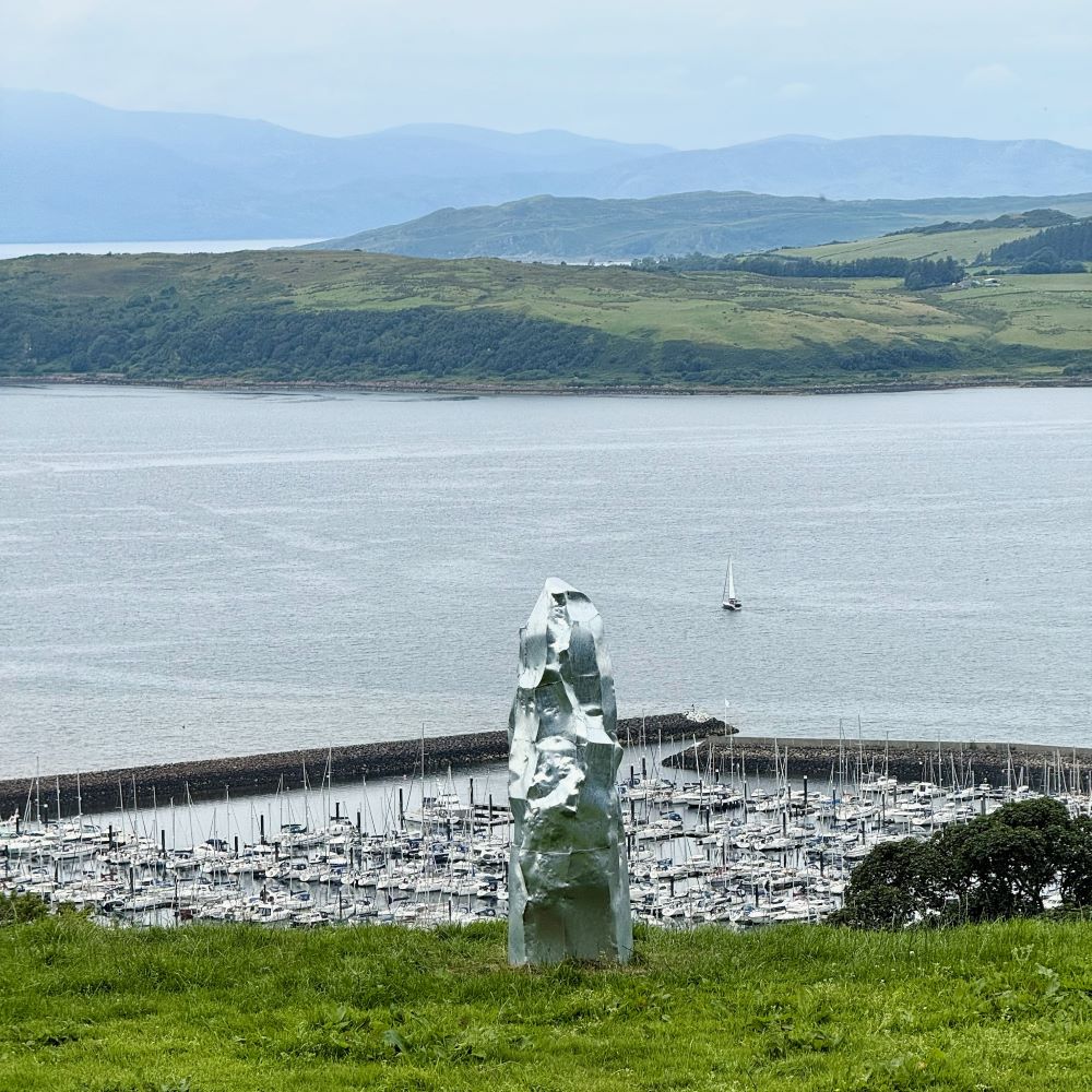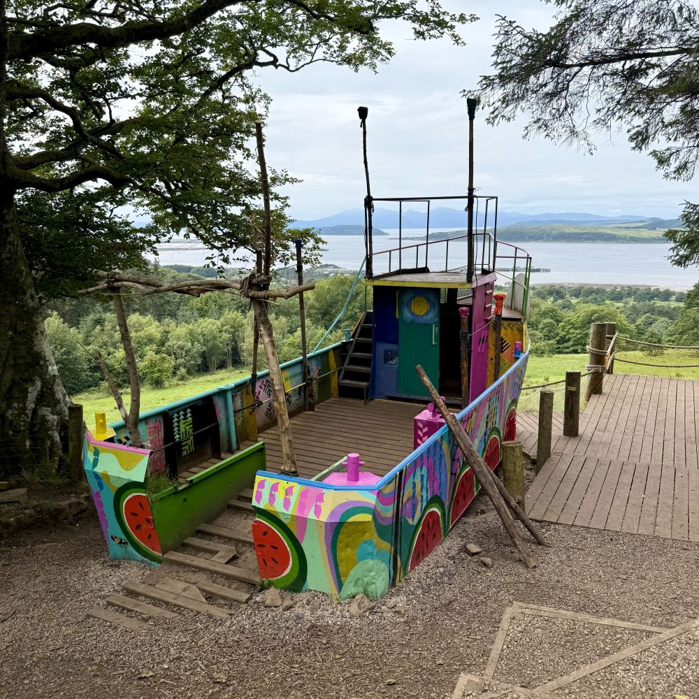 Im nett angelegten Schlosspark erwartet einen zwischen plätschernden Bachläufen und uralten Bäumen ebenfalls viel Kunst, was sich auf der weiteren Strecke nach Largs gar noch fortsetzt. So machte ich meine Pause auf Wanderkilometer 3,4 an Deck eines bunt bemalten Schiffswrack, welches nun als Aussichtspunkt auf einem Hügel thront.