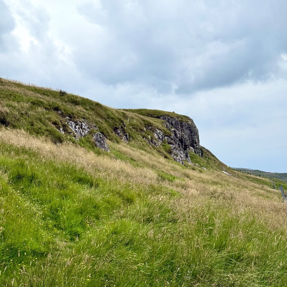 Vom Bahnhof ging es bereits durch ein Wohnviertel bergauf, ehe ich nach einer Viertelstunde den östlichen Stadtrand erreichte. Über Wiesen begann nun der steile Anstieg zu einer breiten Basaltfelswand namens The Quadrocks. Die soll bei Kletterern sehr beliebt sein, aber man kann auch wie ich heute einen klassischen Wanderweg nehmen und somit den Ausblick nach technisch relativ anspruchslosen 45 Minuten bzw. 2,7 km genießen.