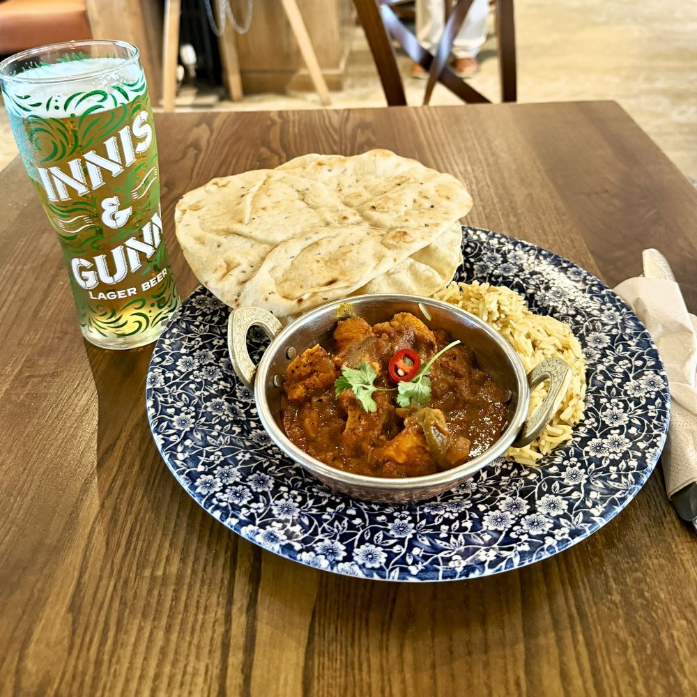 Aber für großartig Geschichte hatte ich jetzt ehrlicherweise auch keinen Kopf mehr. Letzten Endes war ich um exakt 16 Uhr zurück am Bahnhof und bilanzierte dort eine 6,83 Kilometer lange Wanderung mit 260 Höhenmetern. Da hatte ich mir im hiesigen Wetherspoon’s namens The Paddle Steamer doch glatt ’ne Belohnung verdient. Der donnerstägliche Curry Club dieser Pubkette verleitete nun zu Naga Chili Chicken Vindaloo, welches heute zusammen mit einem Pint Innis & Gunn Lager £ 11.29 (ca. 13 €) kostete. Aber entweder bin ich inzwischen ein Weichei oder das schärfste Curry der Karte hat mittlerweile noch ein paar Scoville extra bekommen. In jedem Fall kostete es mich viel Selbstdisziplin komplett aufzuessen.