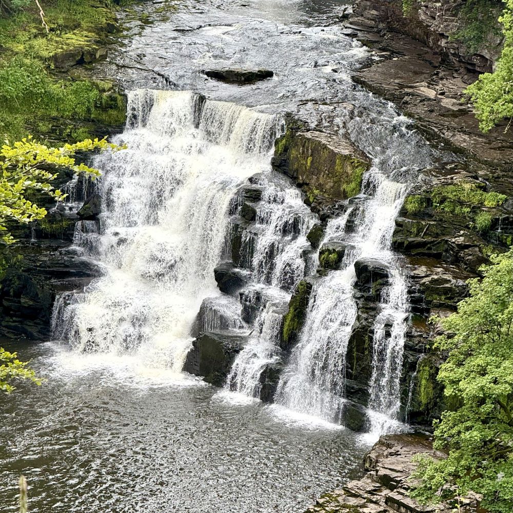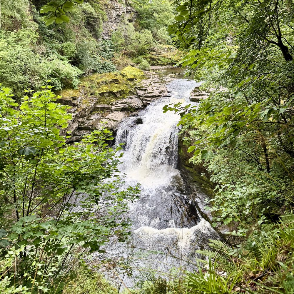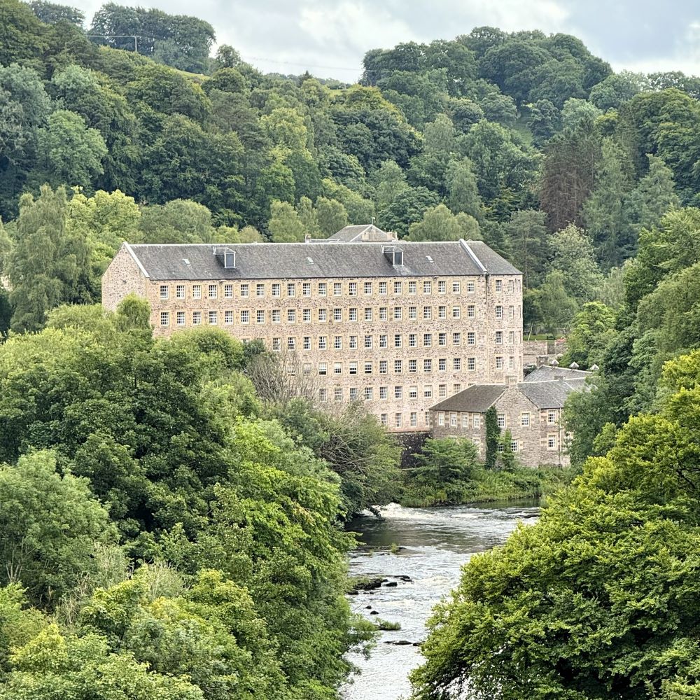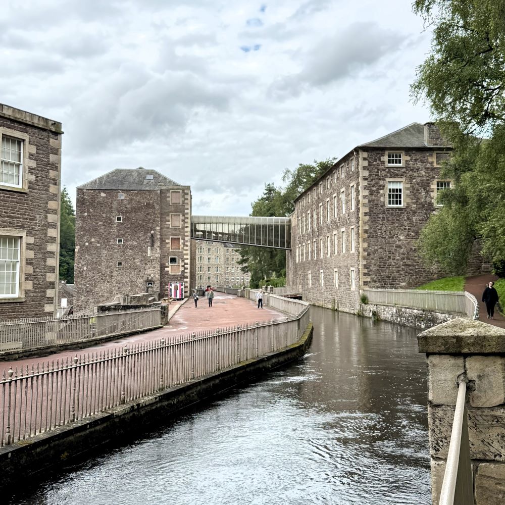 Wie bereits zwei Tage zuvor (siehe Glasgow 07/2025), hatte ich es auf ein Teilstück des insgesamt 65 km langen Clyde Walkway abgesehen. Diesmal wahrscheinlich sogar auf das schönste. Denn auf meiner um 13:45 Uhr gestarteten Tour erwarteten mich mehrere Wasserfälle und eine von der UNESCO im Jahre 2001 zur Welterbestätte geadelte Baumwollspinnerei nebst Musterdorf aus dem 18. Jahrhundert.