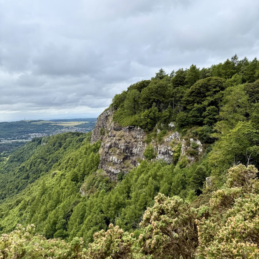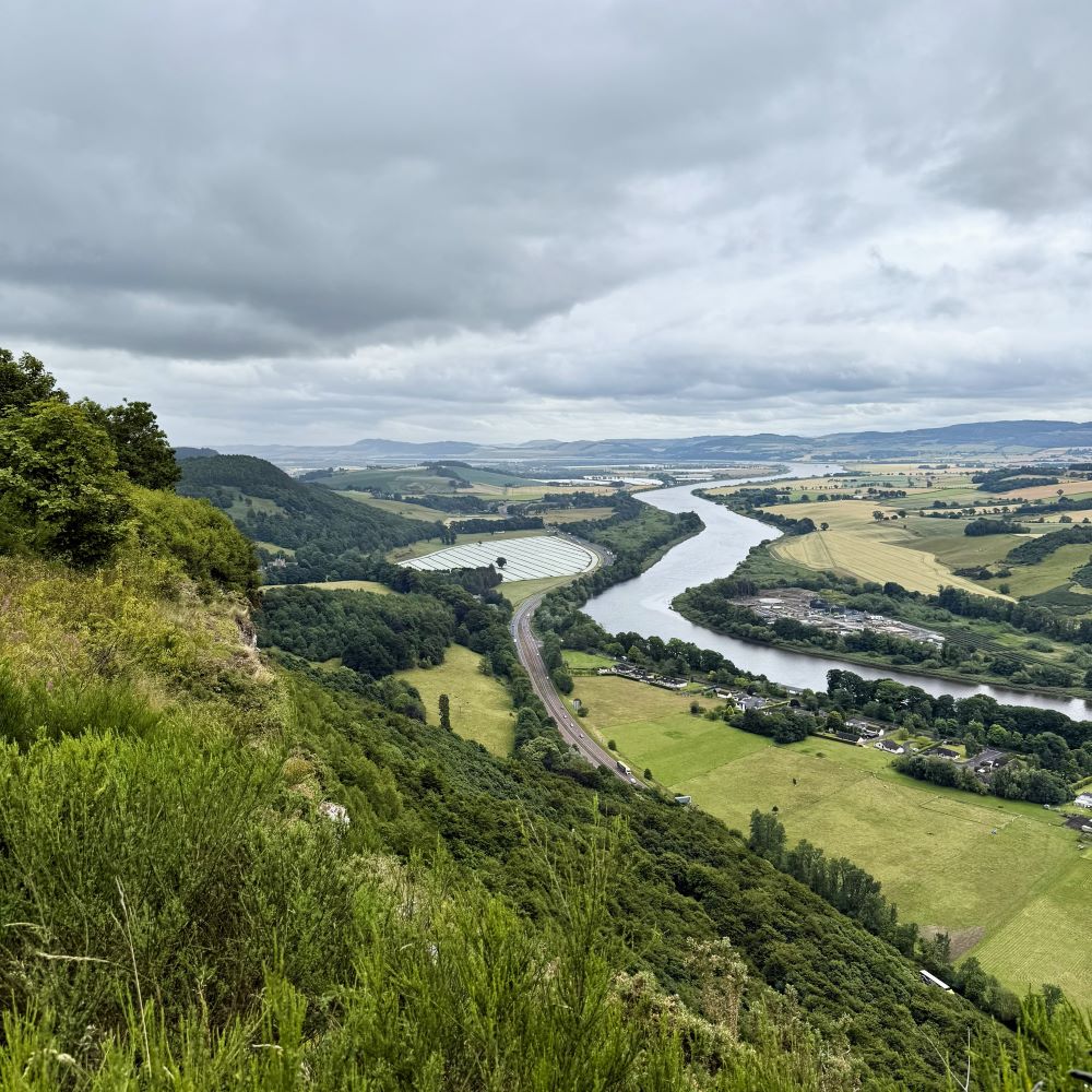 Über 200 m Höhenmeter waren nun auf den nächsten zwei Kilometern zu überwinden, um die Aussicht vom Kinnoull Hill (222 m ü. NN) genießen zu können. Die war selbst an einem bewölkten Tag sehr schön. Unten im Tal schlängelt sich der Tay seiner ca. 40 km entfernten Mündung in die Nordsee entgegen, während am Horizont die Hügelketten der Lowlands für ein schönes Panorama sorgen.