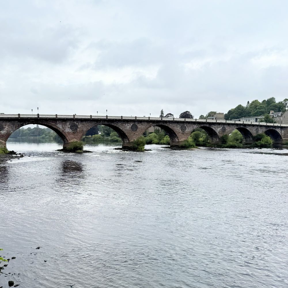 Am Dienstag schien sich das Wetter gegenüber Montag genau umgekehrt zu verhalten. Morgens gab es herrlichen Sonnenschein, während es ab mittags in Glasgow heftig regnen sollte. Zwar ging es nach dem Frühstück um 10:41 Uhr für £ 20.80 (ca. 24 €) return per InterCity ins 96 km entfernte Perth, allerdings gab es für den eine Stunde später erreichten Zielort ähnlich trübe Aussichten.