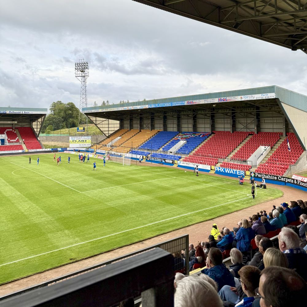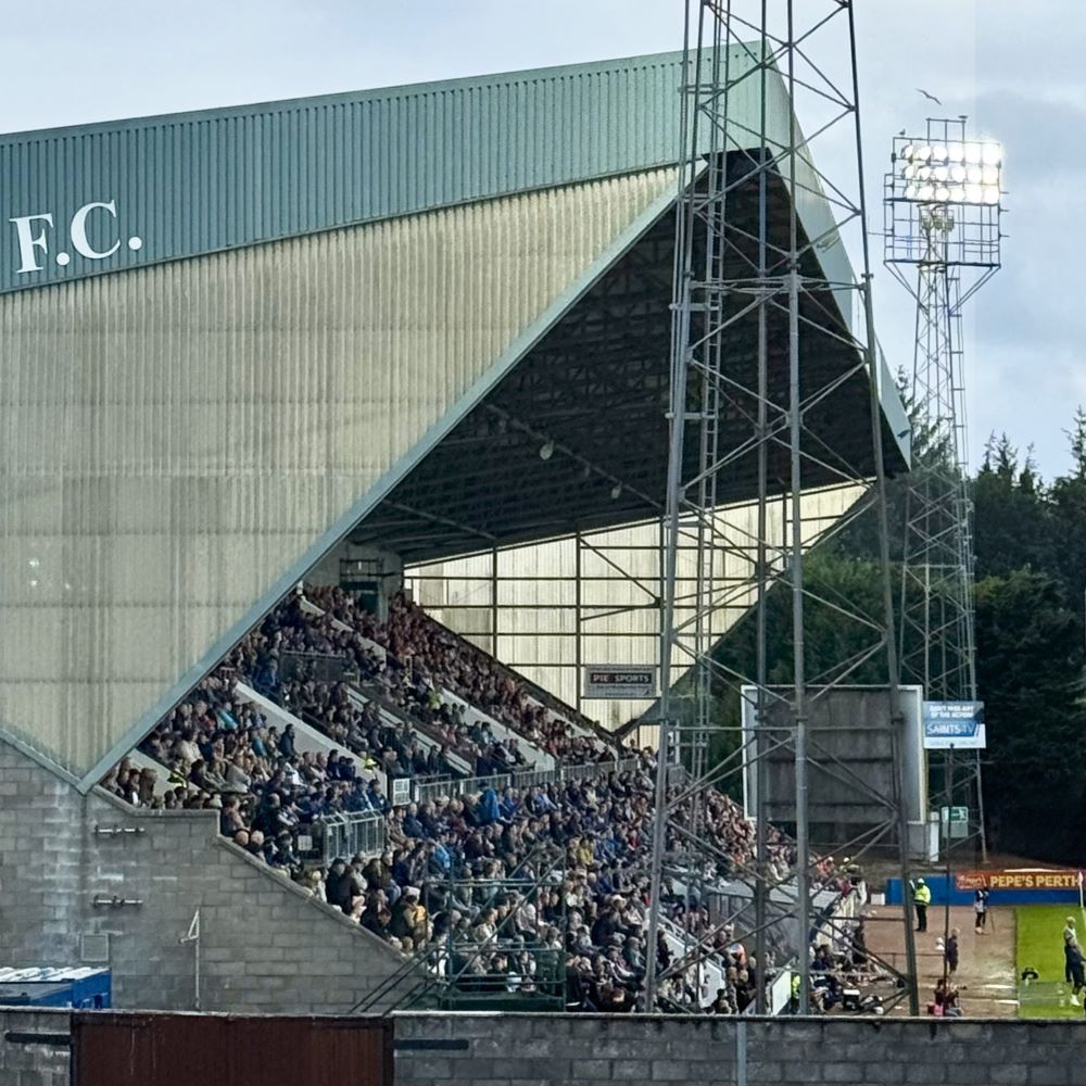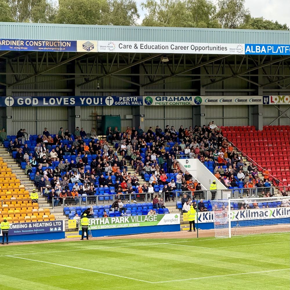 Eigentlich sollte bei diesem kurzfristig für heute Abend um 19:30 Uhr anberaumtem Freundschaftsspiel auch lediglich jene Haupttribüne geöffnet sein. Aber weil aus dem gerade einmal 35 km entfernten Dundee doch ein größerer Anhang als erwartet angereist war, wurde ein Teil von ihnen noch im etatmäßigen Away End untergebracht. Der Großteil der Fans des Dundee United FC saß allerdings zusammen mit den Heimfans und dem mutmaßlich einzigen Hopper auf der Haupttribüne. Ein Indiz dafür, dass das so genannte Tayside Derby zwischen den beiden Clubs nicht zu den 100 brisantesten Fußballansetzungen auf diesem Kontinent gehört.