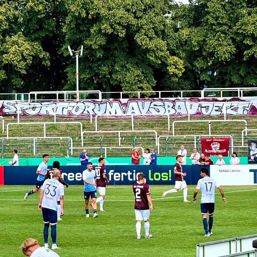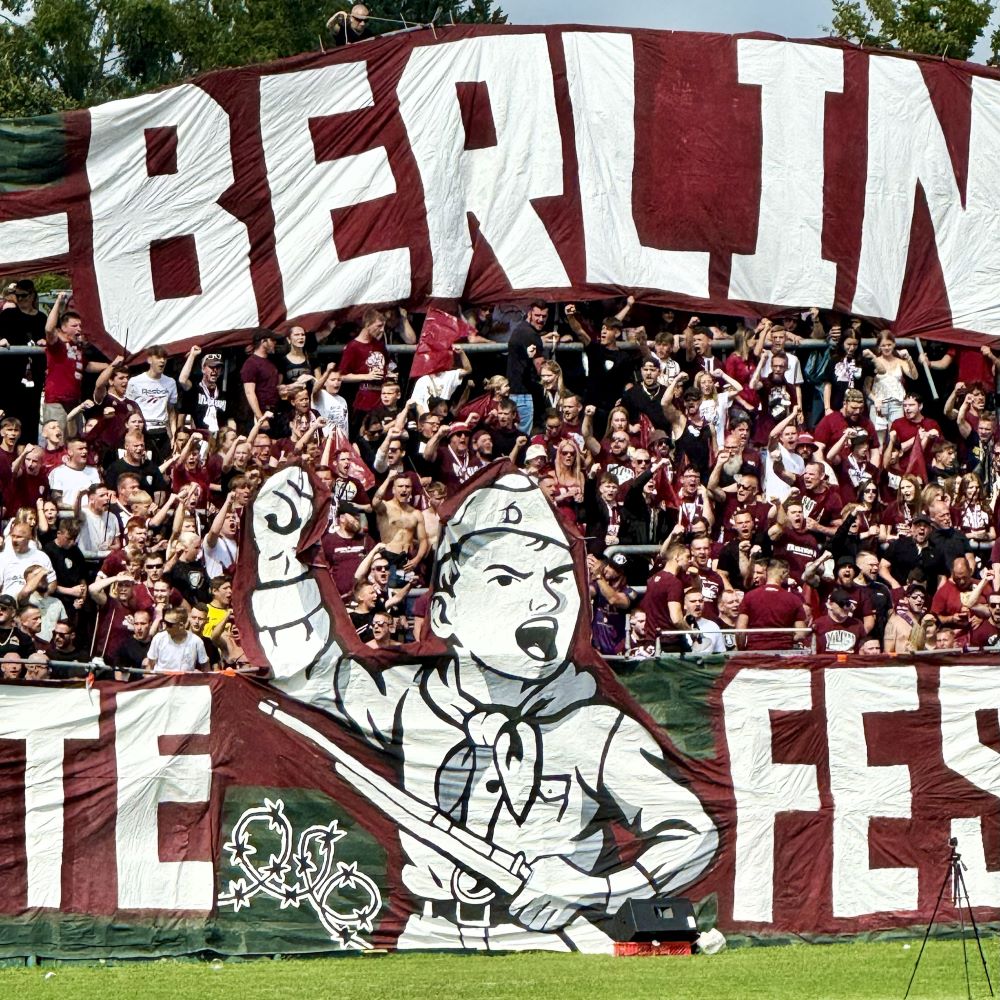 Aber immerhin sicherte man sich mit einer kleinen Spruchbandaktion anerkennenden Applaus der Berliner. Denn der in der 30. Minute im Gästesektor präsentierte Halbsatz „Der Ausbau des Sportforums ist so unverhandelbar…“ wurde im Heimbereich mit „…wie das Ruhrstadion an der Castroper!“ zum gemeinsamen Statement für den Ausbau des Sportforums in Hohenschönhausen vervollständigt. Jene geforderte Modernisierung der 1959 eröffneten Sportstätte zum drittligatauglichen Stadion hatte es eigentlich 2023 in den Koalitionsvertrag der schwarz-roten Landesregierung geschafft, steht mittlerweile jedoch wieder auf der Kippe.