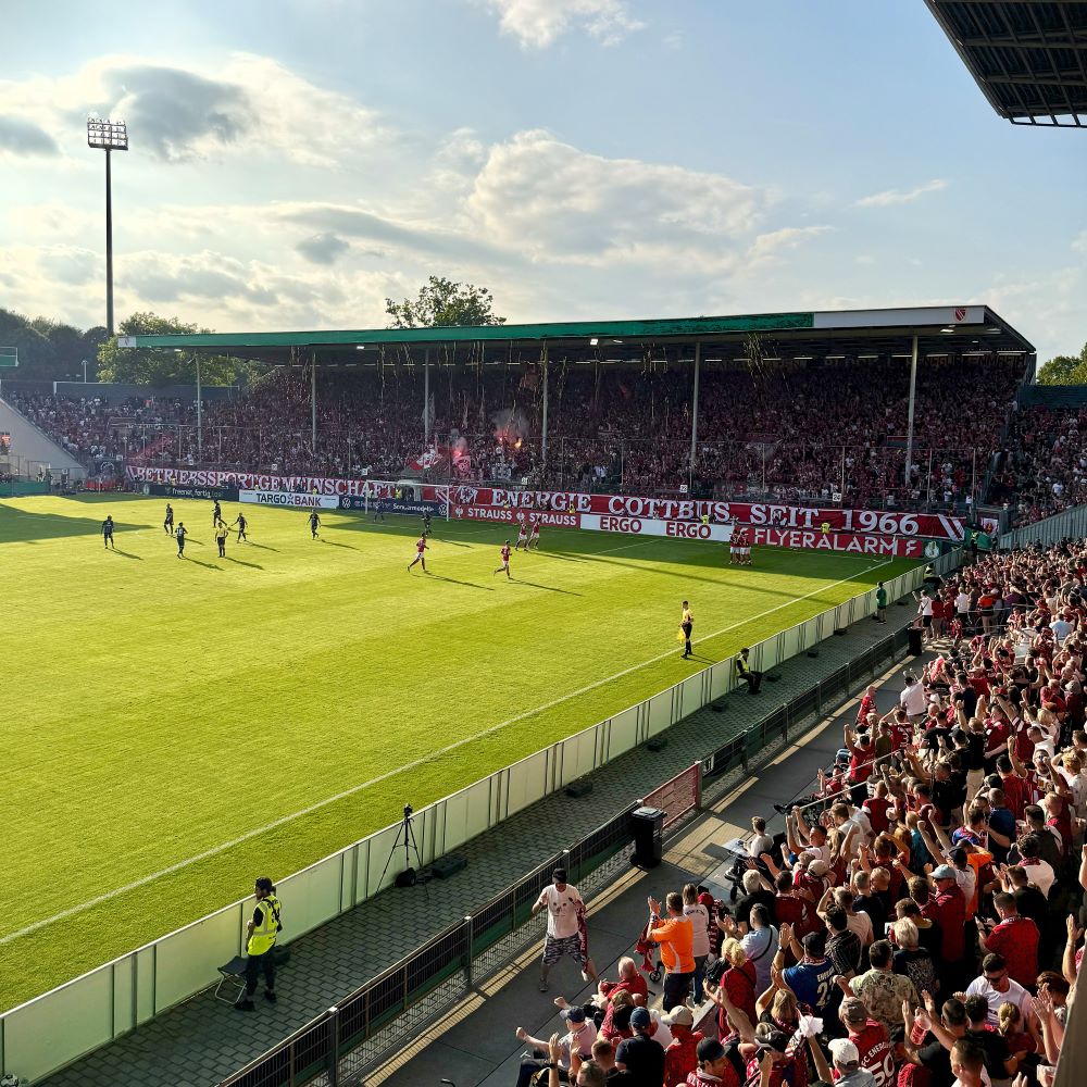In Cottbus kamen wir ziemlich genau eine Stunde vor Anpfiff an und spazierten in der Nachmittagssonne zum 1,5 km vom Hauptbahnhof entfernten Stadion der Freundschaft. An den Stadiontoren trennten sich allerdings unsere Wege. Denn Niklas und Lumi saßen auf der Haupttribüne, während ich meinen Sitzplatz auf der Gegengerade hatte. Dort empfing mich um 17:40 Uhr bereits mein Sitznachbar Jojo, der mir freundlicherweise im Vorverkauf ein 36 € teures Ticket mitgekauft hatte.