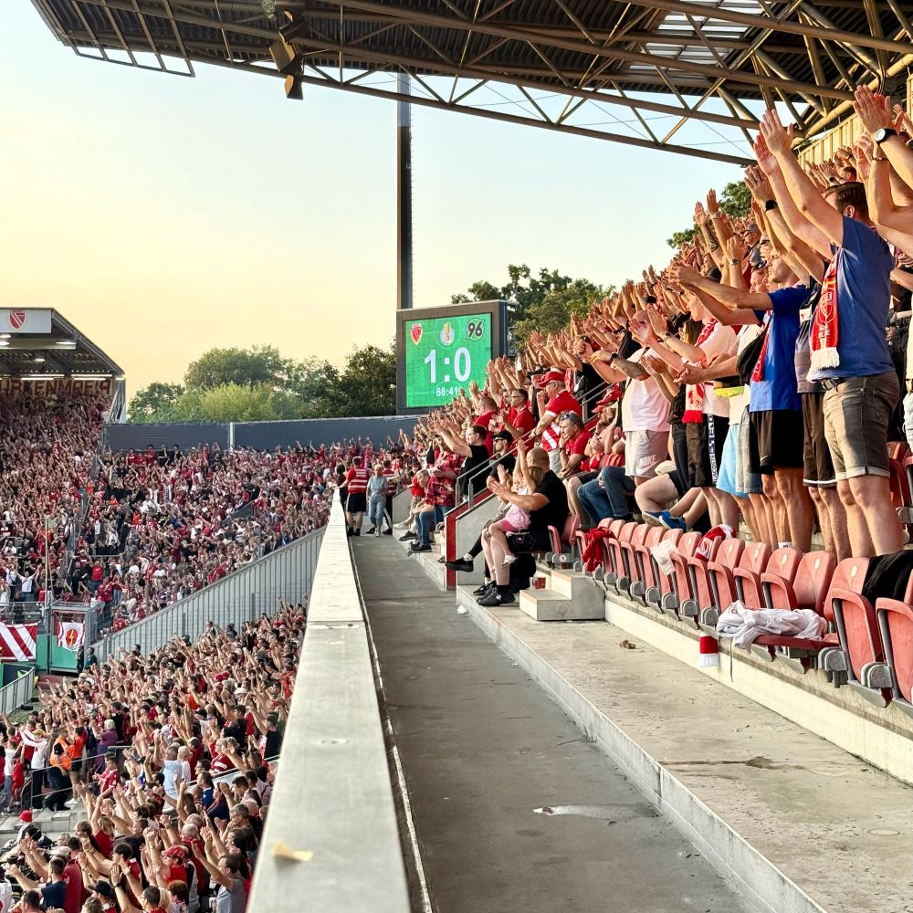 Dass nun im Heimbereich tatsächlich einige Fans mit blanker Brust zu erspähen waren, schiebe ich allerdings nicht auf den Raub der im Gästeblock verbrannten Oberbekleidung. Das wird wohl eher am schönen Wetter und vor allem am guten Auftritt der Heimelf gelegen haben. Denn Tolcay Ciğerci sorgte mit dem ersten Torschuss des Abends gleich mal für die Führung (12.) und ein erstmals an diesem Abend bebendes Stadion der Freundschaft.