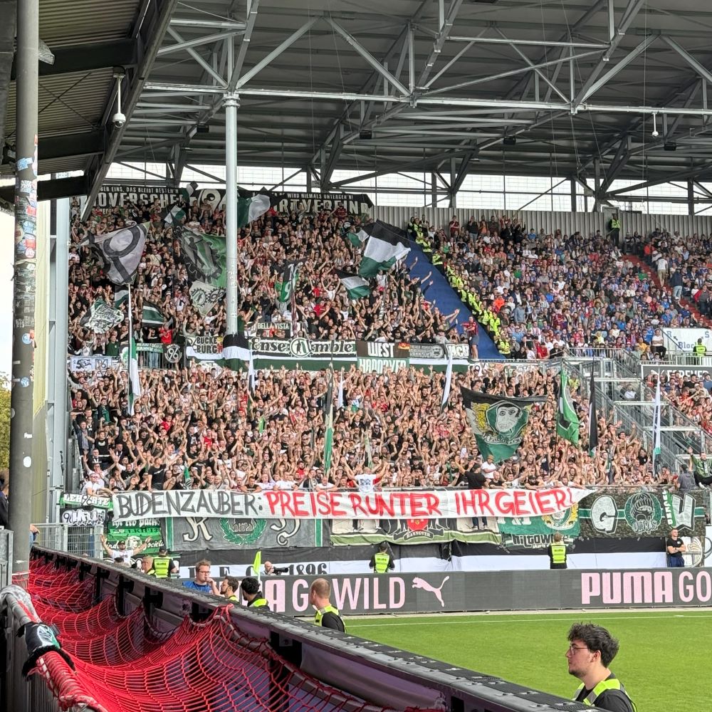 Heute machten die Gruppen Compagno und New Connection mit Handzetteln auf den Boykott und dessen Intention aufmerksam. Außerdem prangte ein Banner mit der Aufschrift „Budenzauber boykottieren“ vor der Heimkurve und der Gästesektor zeigte sich heute gerne solidarisch. Einerseits hatte Hannovereint alle mitreisenden Fans dazu aufgerufen ebenfalls keinen Cent bei Budenzauber auszugeben und andererseits hatte man ausreichend Becher zum Zapfen von Leitungswasser verteilt. Obendrein gab es kurz nach Spielbeginn ebenfalls ein Spruchband zu der Thematik. Denn darüber, dass der Besuch eines Fußballspiels bezahlbar bleiben muss, herrscht natürlich in allen Fankurven der Republik ein gewisser Konsens.