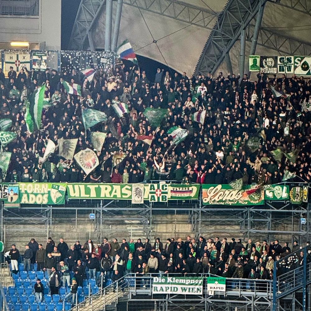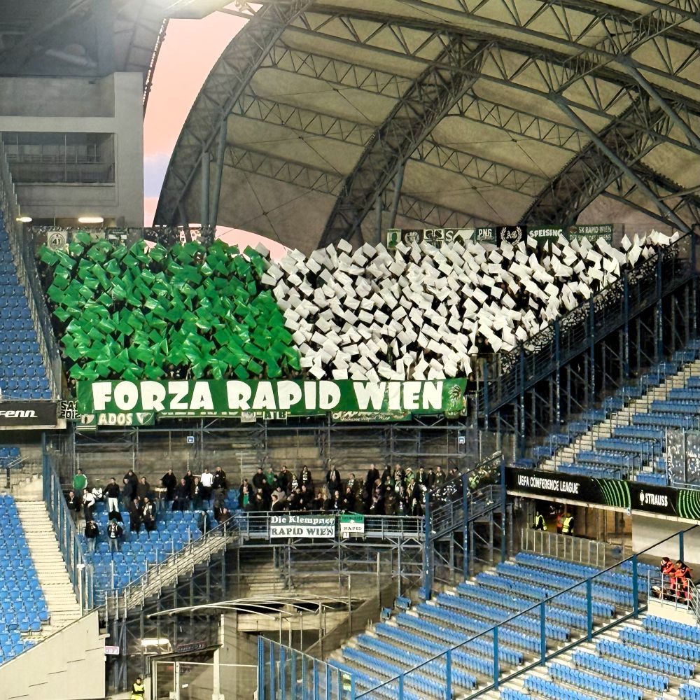Der Anhang des österreichischen Rekordmeisters, der die vorerst letzte der insgesamt 32 Meistertrophäen*** übrigens 2008 überreicht bekam, hatte außerdem ein paar hundert grüne und weiße Fähnchen dabei. Mit diesen, sowie einer Banderole mit der Aufschrift „Forza Rapid Wien“, wurde die Gastmannschaft kurz vor Anpfiff von ihren Fans empfangen. Das goutierten die heute in ihren roten Auswärtsdressen auflaufenden Spieler mit Applaus, bevor sie Aufstellung auf dem Feld nahmen.